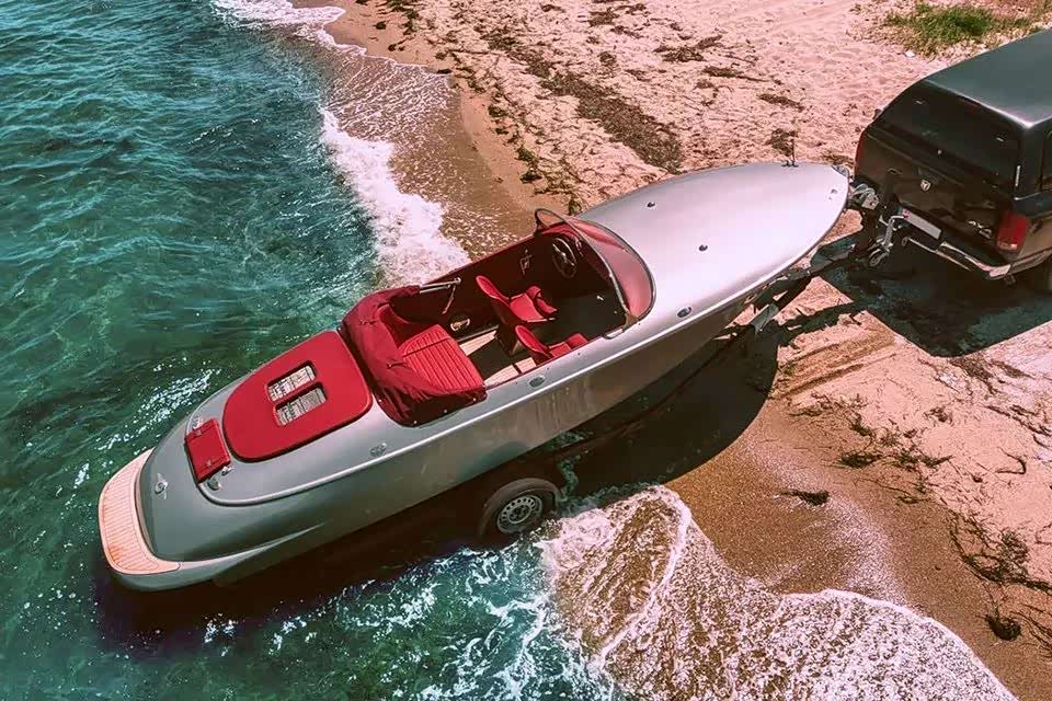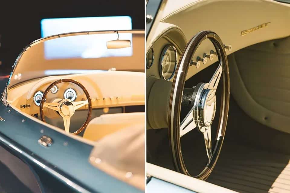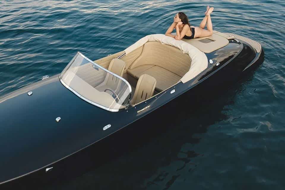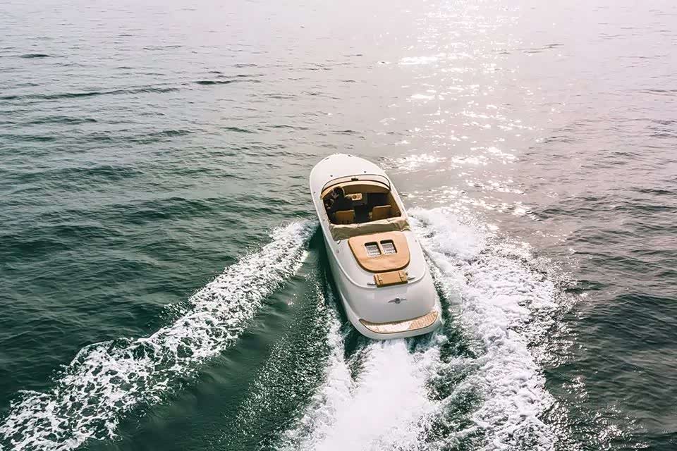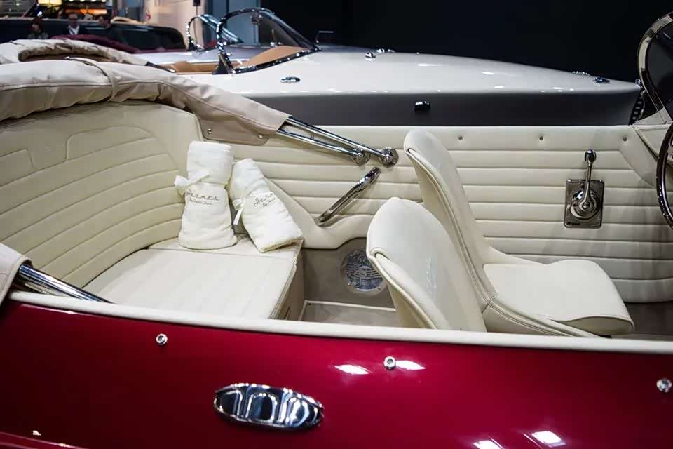 镀铬边框的挡风玻璃和双级进气口体现了该船的时尚外观。更何况,这款356风格的敞篷布上衣赋予了其经典品牌的性格,同时提供了在恶劣天气条件下的安全性。从内部看,它就像你期望的那样豪华。手工制作的桶形座椅、方向盘、开关、扬声器和镀铬仪表盘都将这种复古气息带回了这款怀旧的电动船。这款Hermes Speedster E船可以容纳五名乘客(包括驾驶员)可以乘坐这艘。