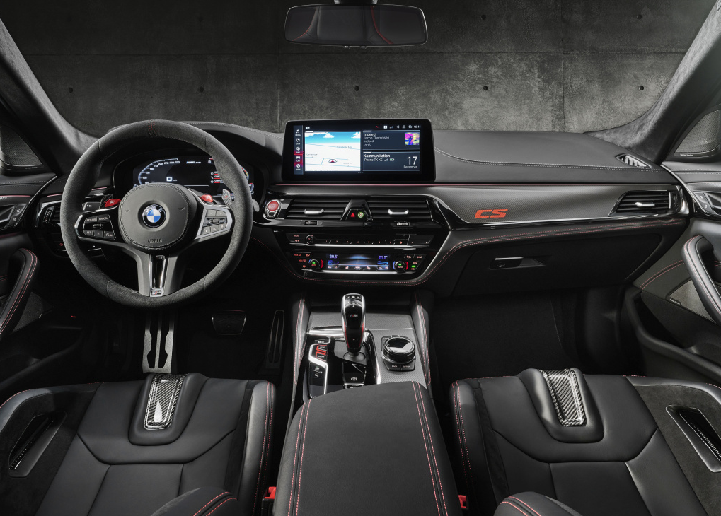 内饰方面,M5 CS还是延续着M5的设计,内部采用了大量的专属化细节, 比如M仪表、M真皮方向盘、M挡把、红色启动按钮及碳纤维饰条,这些都有效提升了内部的战斗感。对于宝马的M4车型还有个好玩之处就是方向盘上的两个红色快捷按键——M1和M2,您可以在两种设置之间快速切换。驾驶员可以使用这些按钮来选择M xDrive,DSC,发动机,变速器,底盘,转向和制动特性,从而构成两个单独的设置,这个在M3、M4等车型身上都能见到。