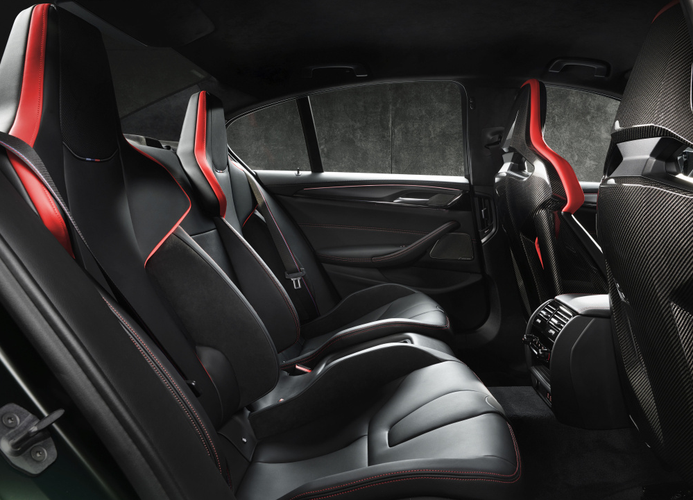 除了这些之外,M5 CS版本最大的特征点在于配备了4张Vernasca真皮一体式头枕的M Sport桶形运动座椅,光看造型就知道这个座椅的包裹性有多强了,前后排都采用相同座椅这很少见,看来,M5 CS没想好好过日子了,后排的乘客也要战斗起来。