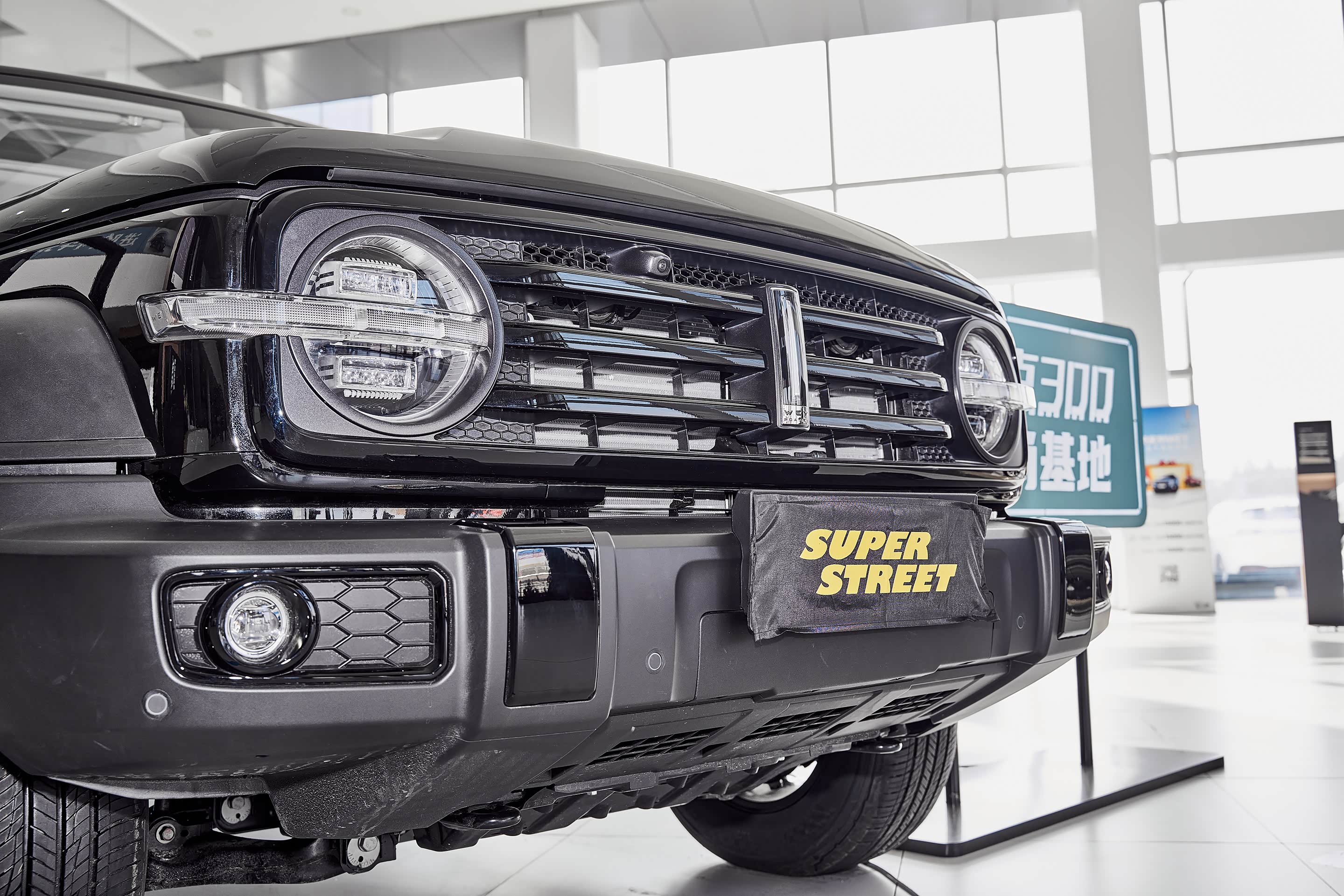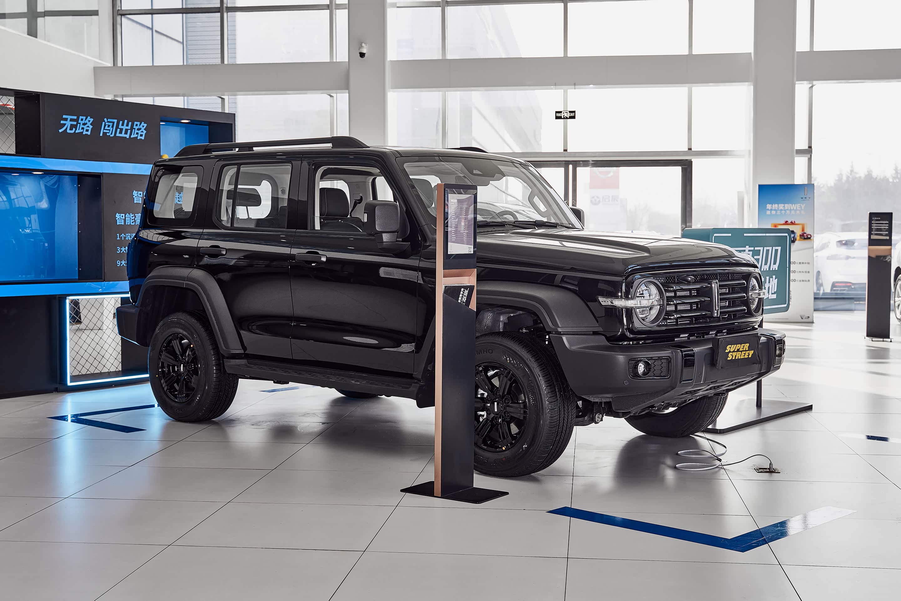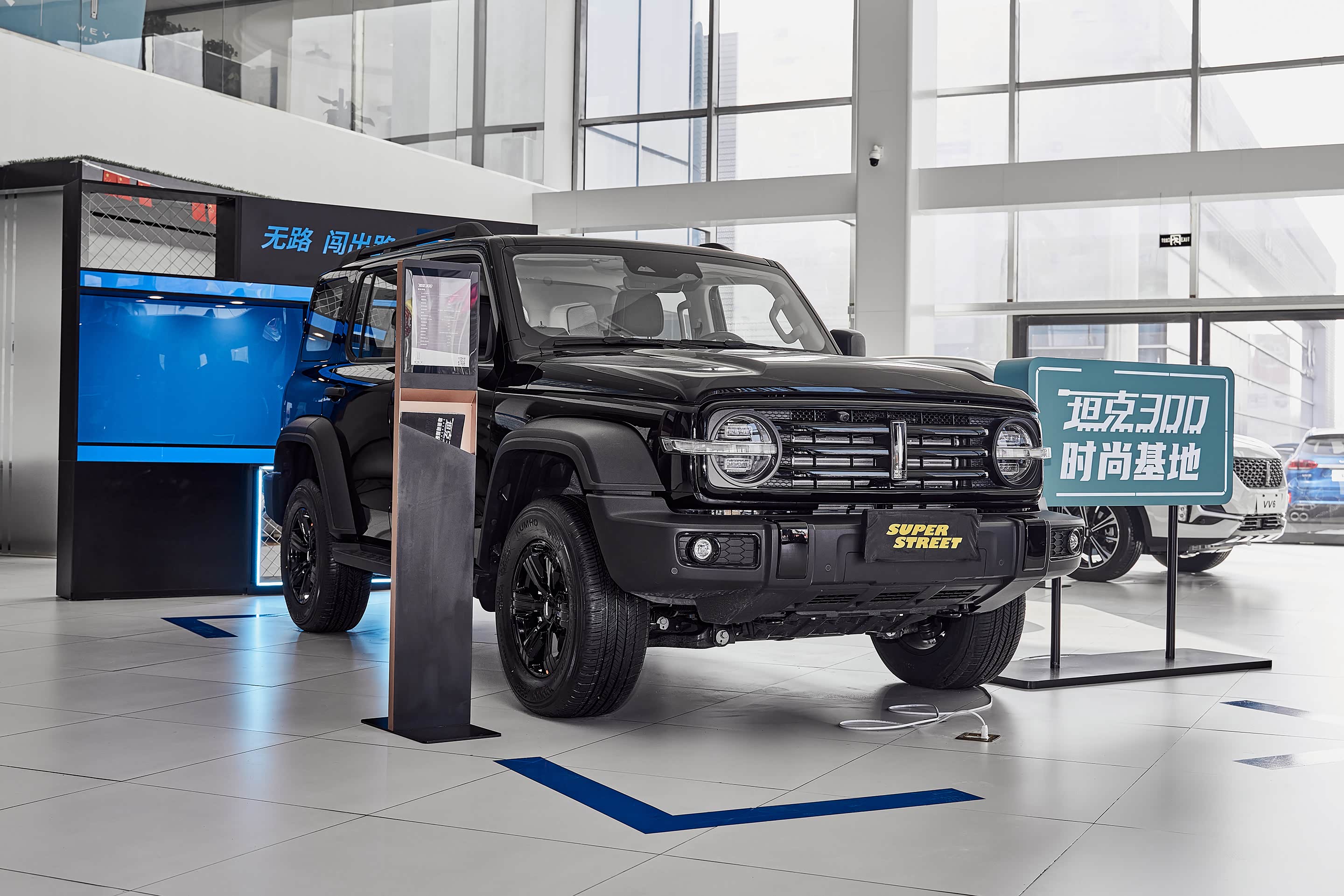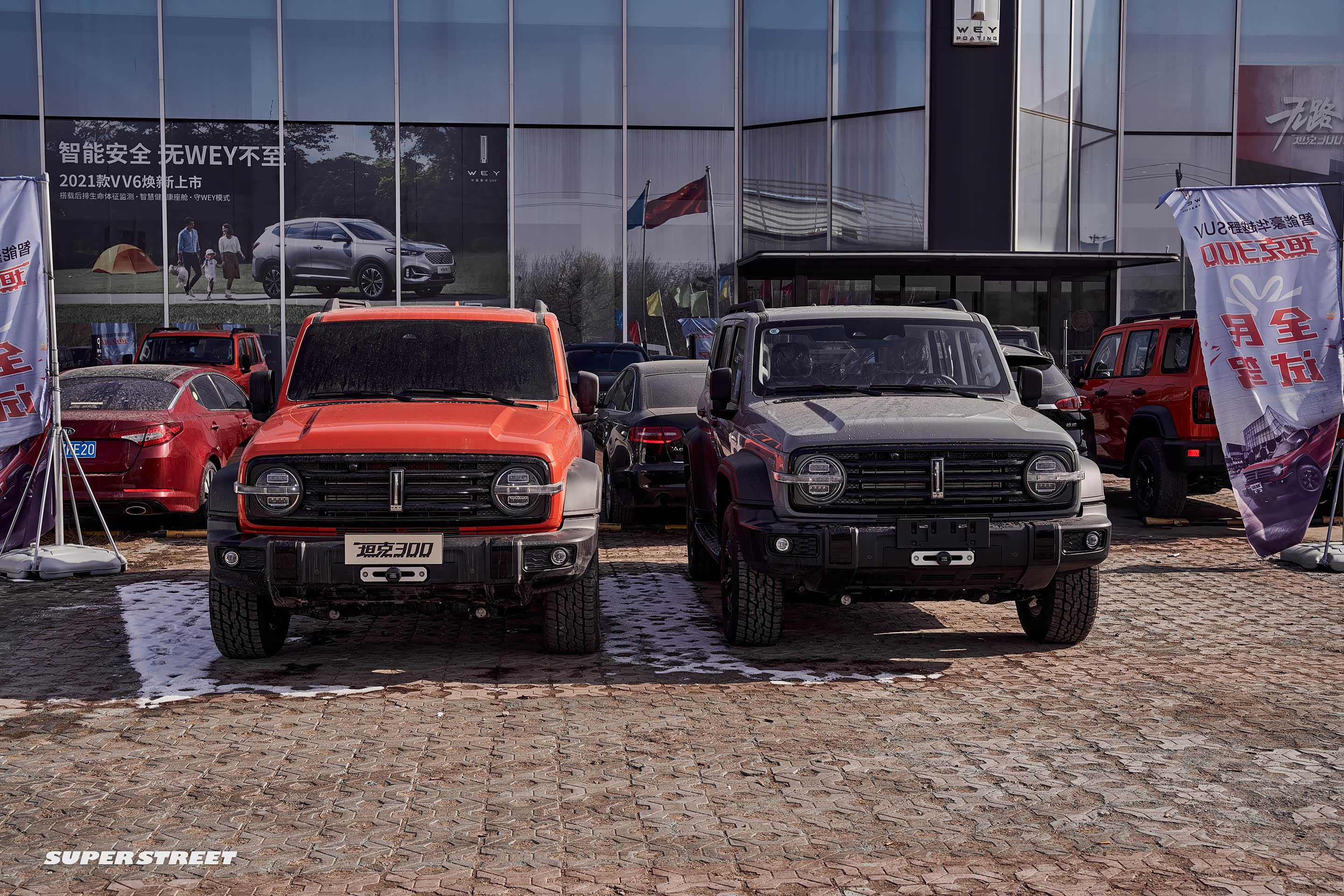 在展厅外面停着各种颜色的 坦克300,白富美(白色)、黑凤梨(黑色)、我要红(红色)、心想事橙(橙色)、灰太浪(灰色),这五种颜色已经齐全了。