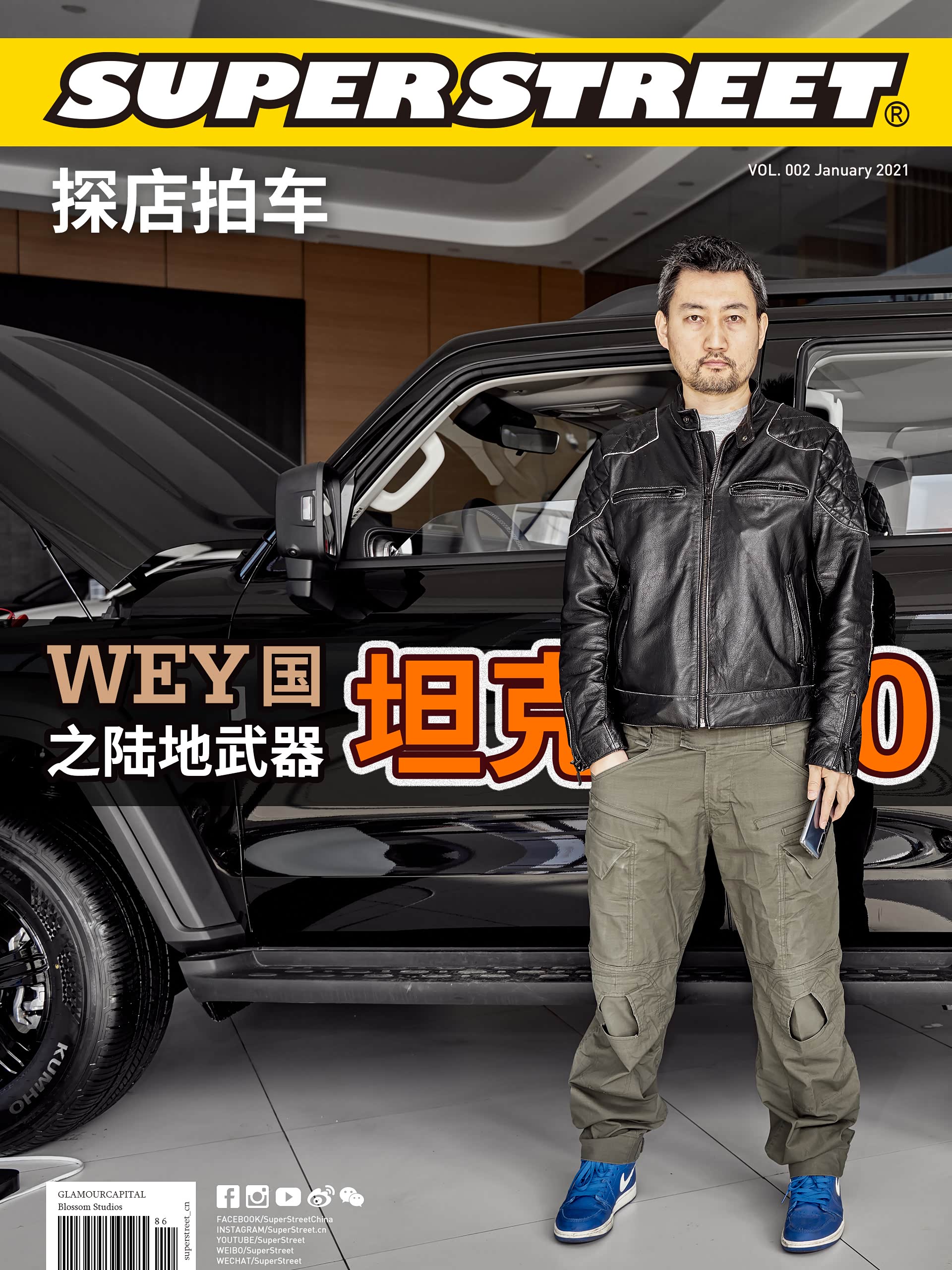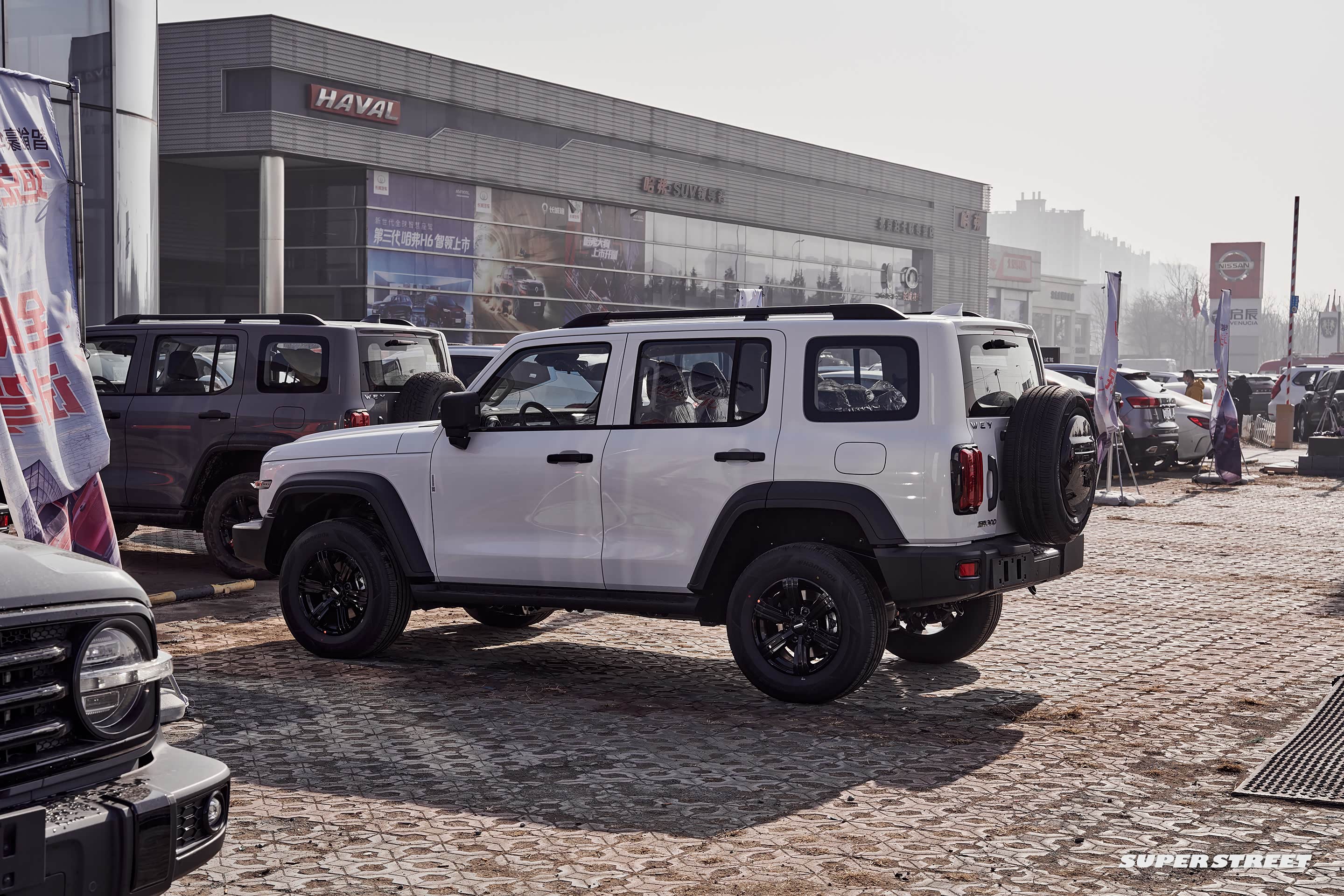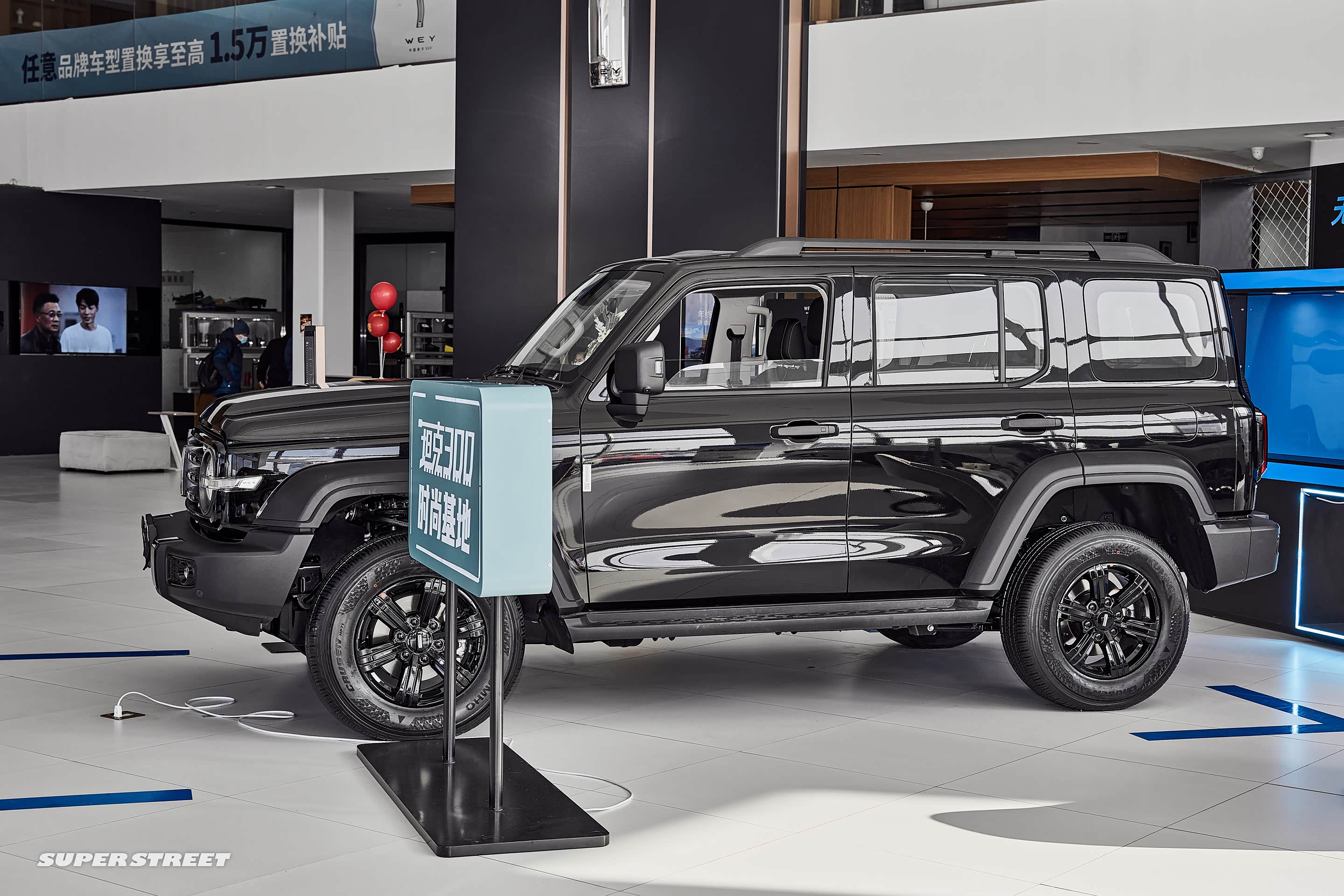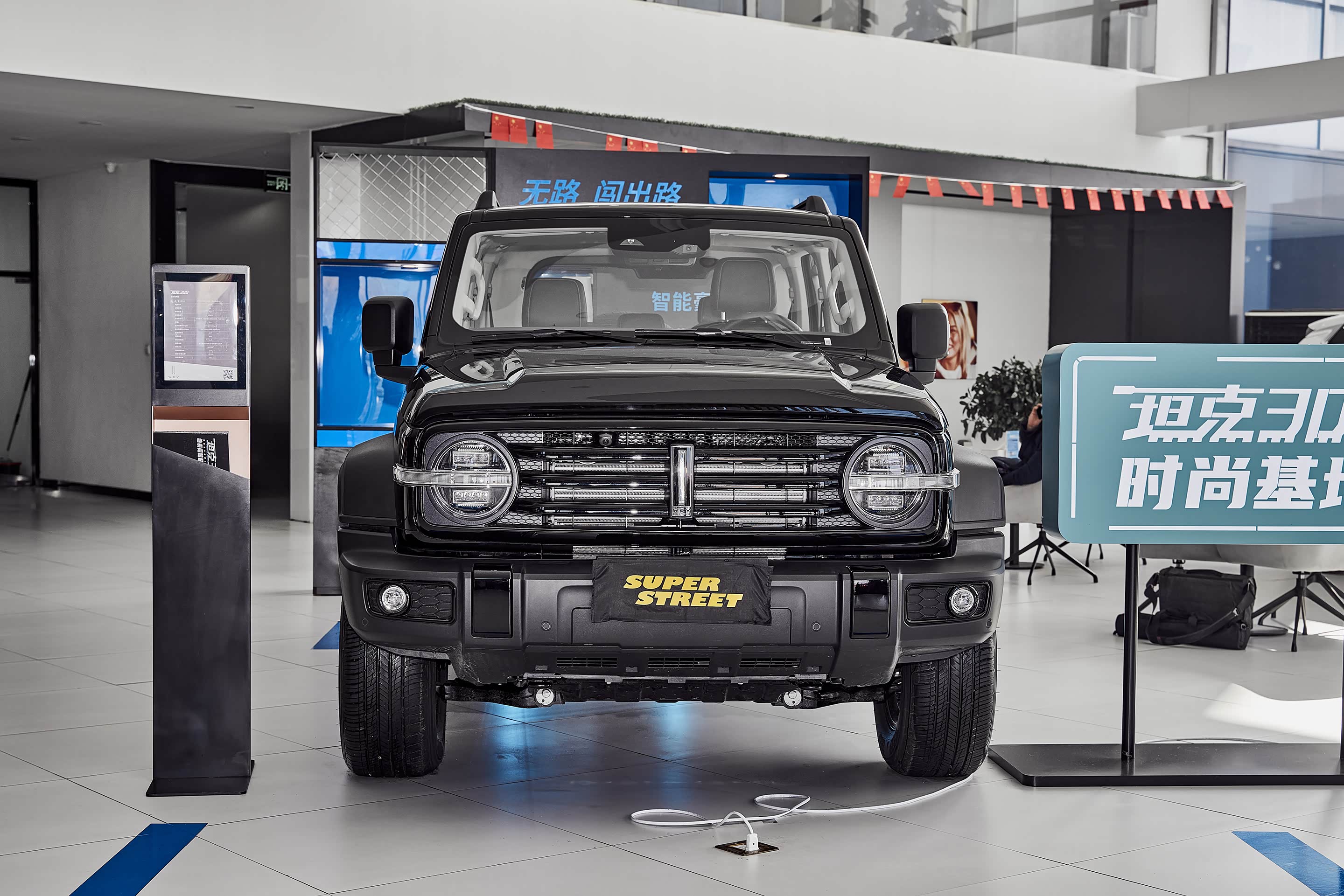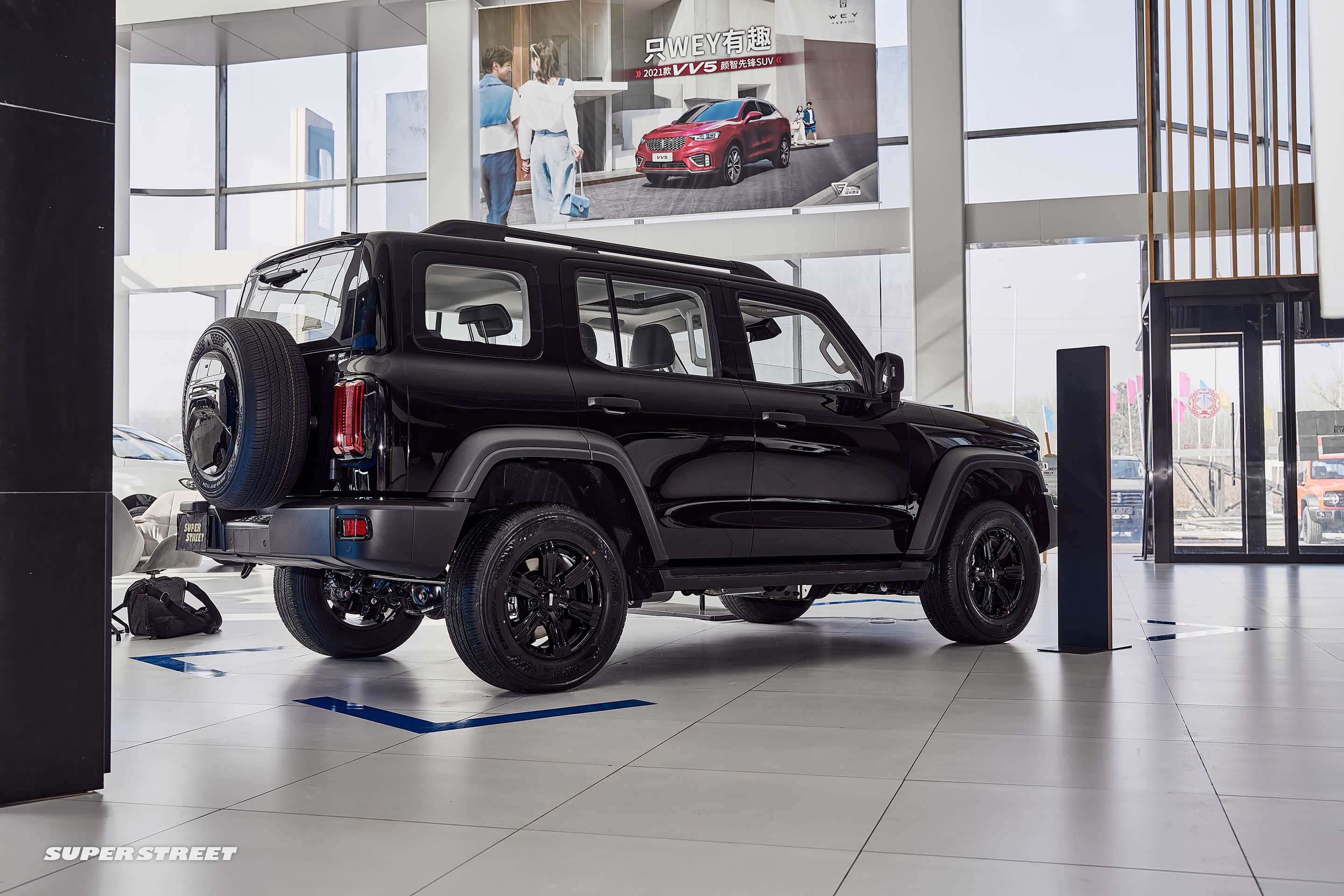 在展厅外面停着各种颜色的 坦克300,白富美(白色)、黑凤梨(黑色)、我要红(红色)、心想事橙(橙色)、灰太浪(灰色),这五种颜色已经齐全了。