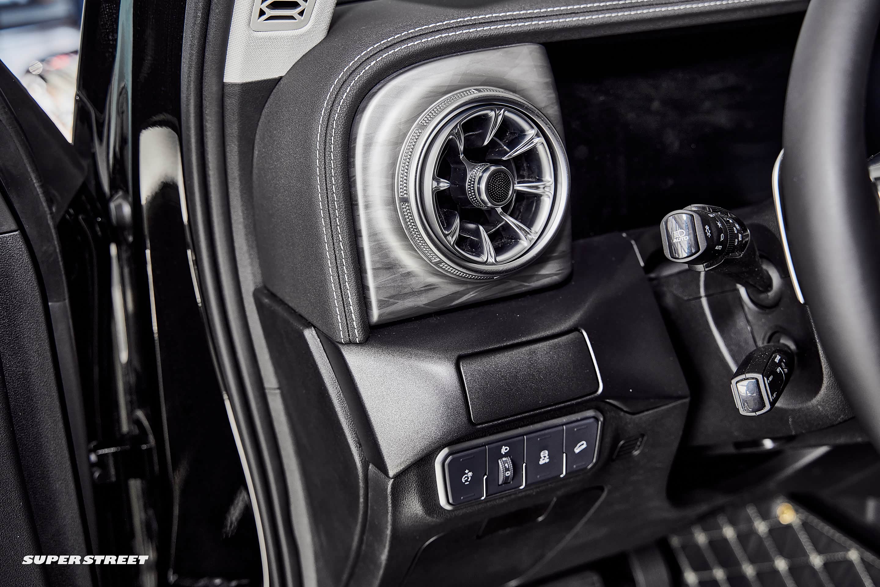 主驾驶左侧的功能区域,有4个按钮,分别是仪表盘的亮度调节、大灯高度调节、车身稳定系统和陡坡缓降功能。上面的空调出风口的还是很吸引人的。