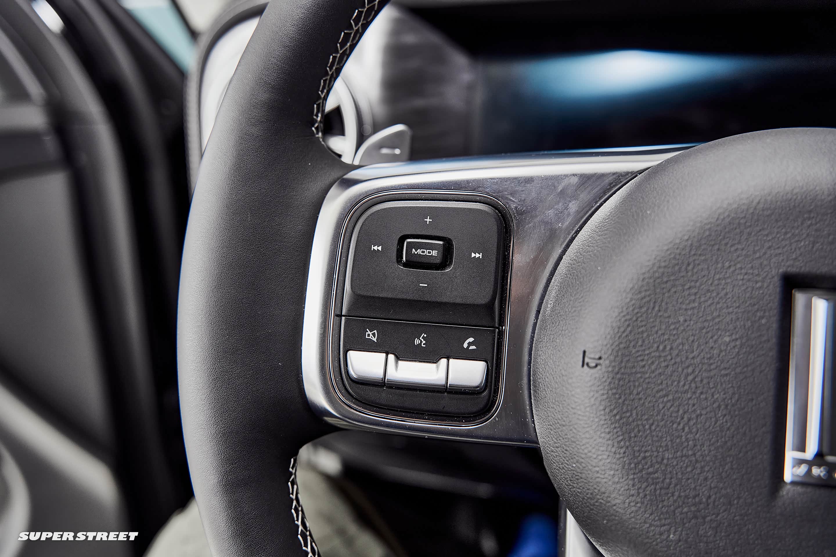 方向盘上的功能键,左侧是音乐控制、蓝牙电话、语音控制,右侧按钮应该是控制仪表盘内的设置。