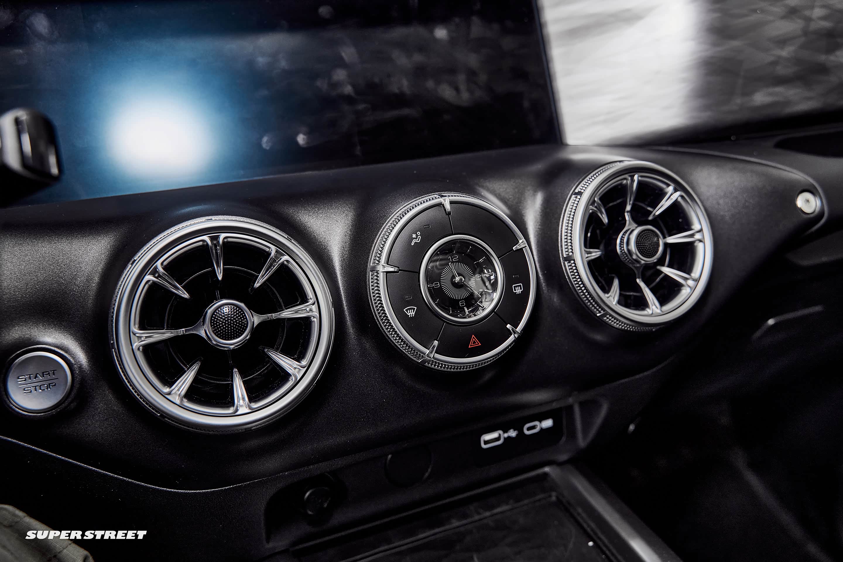 两侧是空调出风口,中间的圆形是调节空调的按钮,中间的时钟不如改成海拔、气压等数据表,更符合越野车型的身份,也更实用。