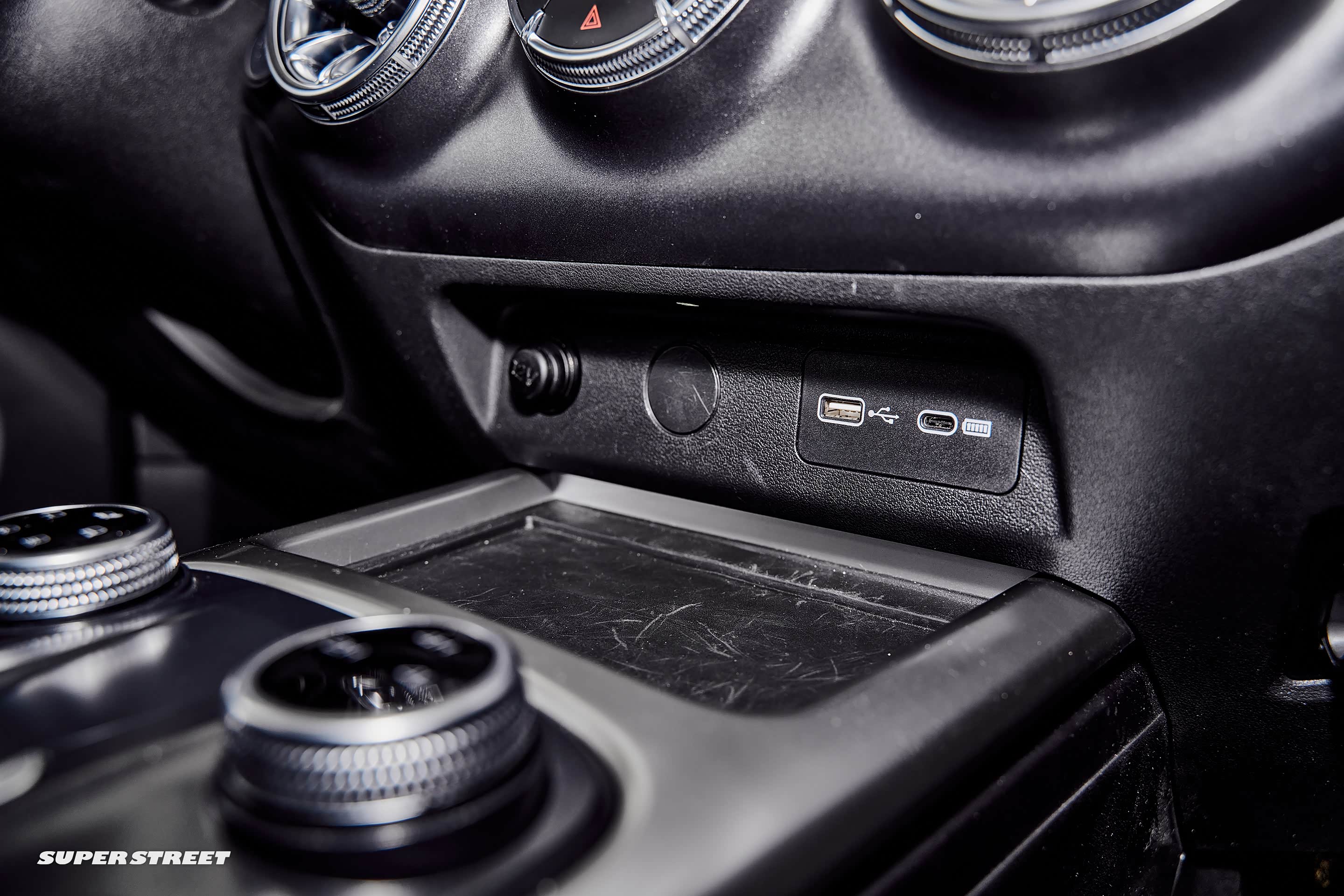 中控台下面有一个可以放置手机的地方,左侧是点烟器,紧挨着是一个圆形挡板,是不是之前设计的是两个点烟器,现在只给了一个?右边是一个USB接口和一个TYPE-C接口。其实现在常用的还是USB接口,这样还得配备两种线材。