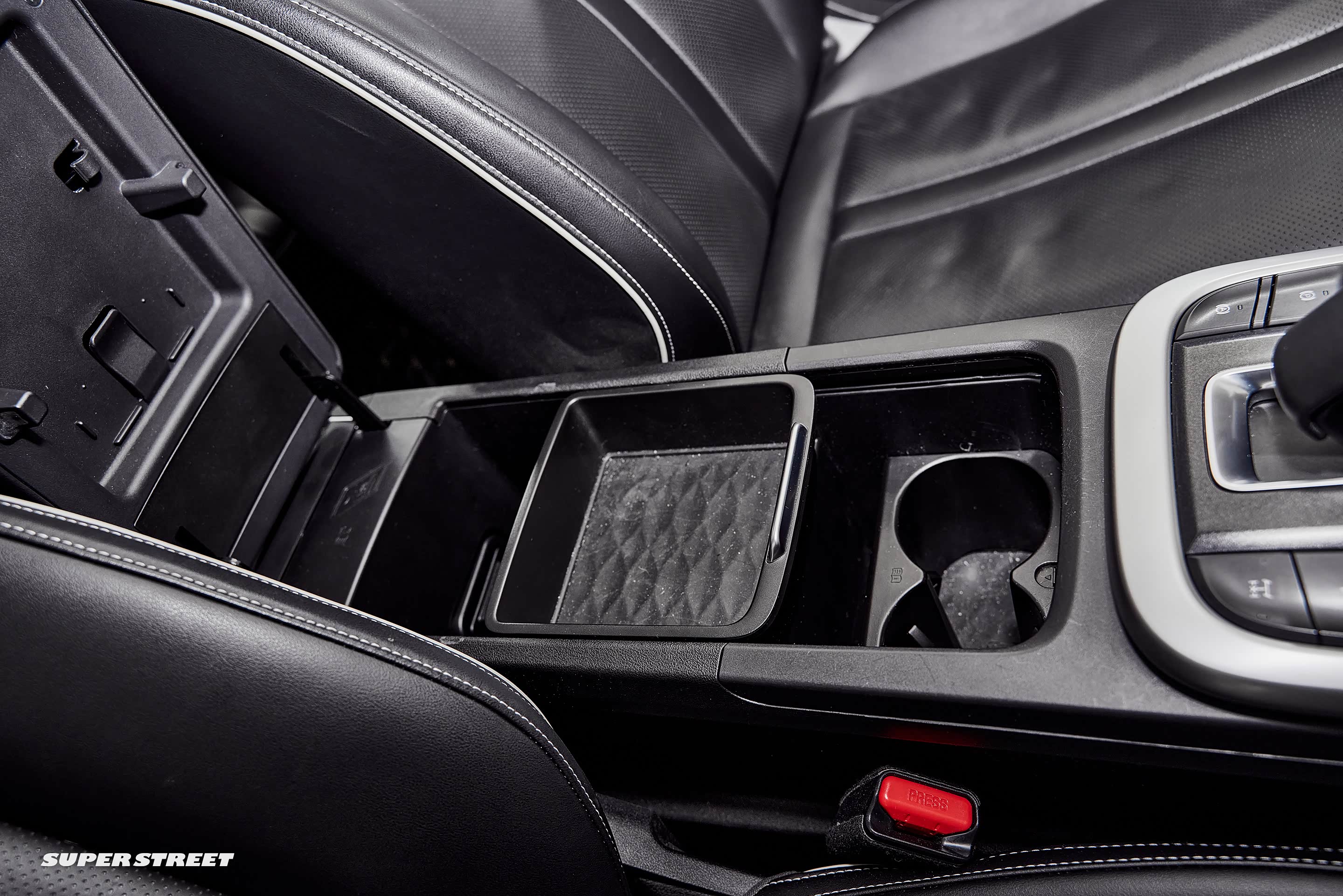 打开扶手箱,上层是一个可以前后移动的储物格,和杯架在一起的,下面的储物空间不是很大。
