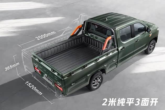 新车基于用户需求的调研,五菱征途打造了长度两米、底部纯平、可三面打开的大货箱,来适用于更多场合、覆盖更多行业、满足更多用户的需求。货箱尺寸为长2000mm、宽1520mm、高365mm,箱面离地高度790mm,结合纯平的箱底,具备明显的装载优势和极强的可拓展性。更重要的是,货箱内部加入了高分子涂层装甲,耐磨损,抗冲击,防水及耐腐蚀性能优异,极大提升了使用寿命。
