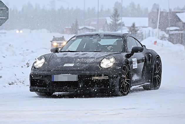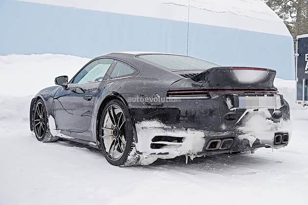 与之前曝光的谍照不同,“Ducktail”原型车换掉了之前两个圆形的排气系统,车尾采用了四出矩形排气系统,类似的系统通常可以在Panamera或Cayenne Turbo上看到。并且911 Turbo后轮拱前方巨大进气口已经被封闭,可能与瑞典的极寒天气有关,也不排除是一种伪装。