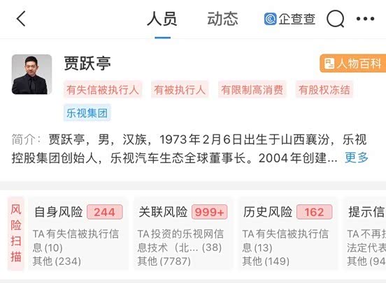 反观贾跃亭,除了债务之外,他几乎一无所有。2017年7月,贾跃亭赴美不归。同月,其所持乐视网股份被全部冻结。目前的工商信息显示,贾跃亭自身风险244条,他56次被列为被执行人,被执行总额高达220.46亿元。截至2021年1月初,他已经被法院连续29次限制高消费。