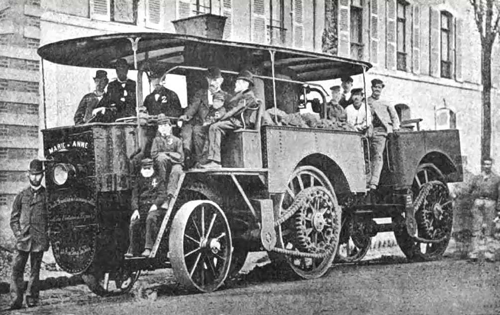 - 1870年8月25日,法国发明家Ernest Michaux(脚踏自行车发明者Pierre Michaux之子)首次测试了他制造的蒸汽动力牵引车,牵引一部大型敞篷马车在巴黎和圣日耳曼昂莱之间做了一次往返行驶,总行程126公里,用时7小时08分。