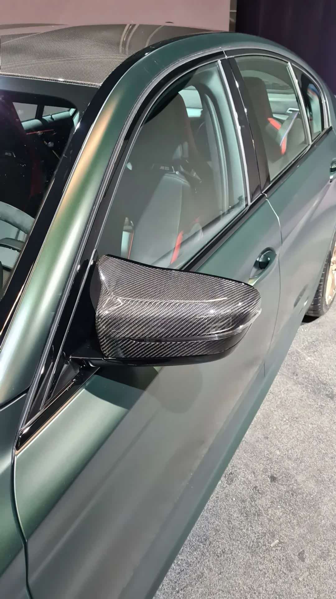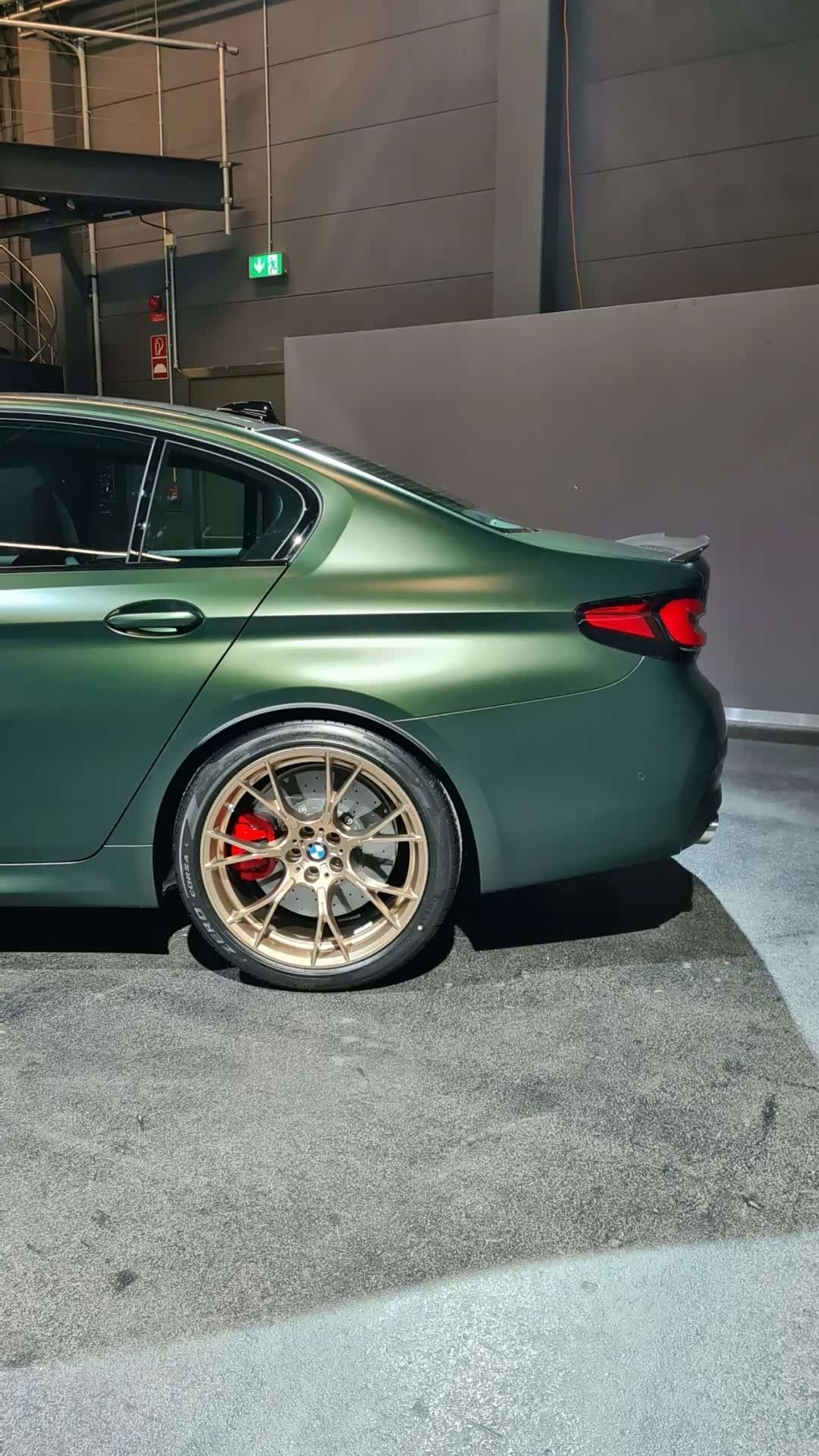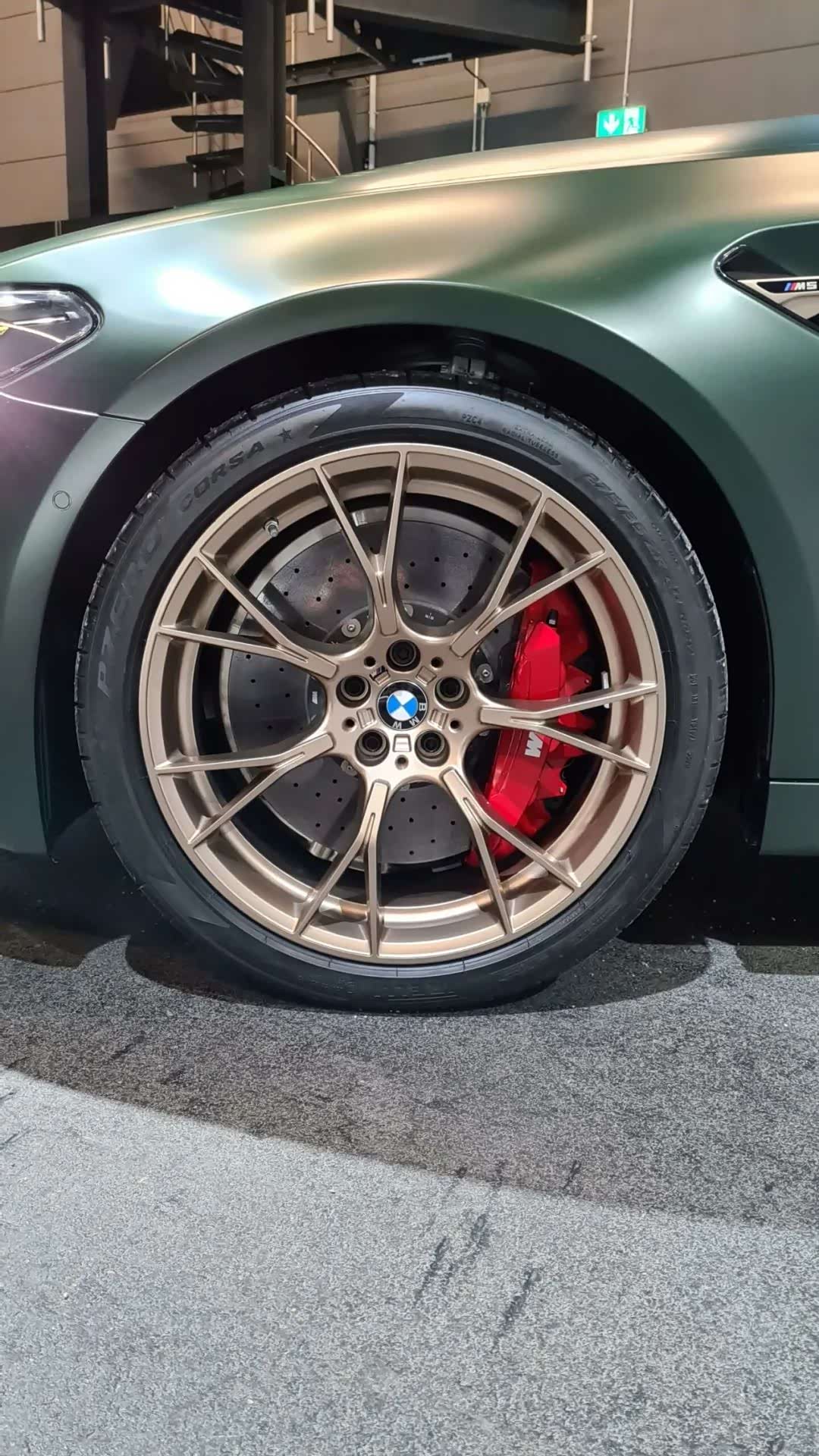 侧翼子板、轮毂等地方都换装了金铜色的组件,同时带有“M5 CS”的专属标识,可配备倍耐力P Zero Corsa轮胎(前275/后285),而且红色的M碳陶刹车系统看起来更加具有辨识度,外后视镜壳也是碳纤维材质的。