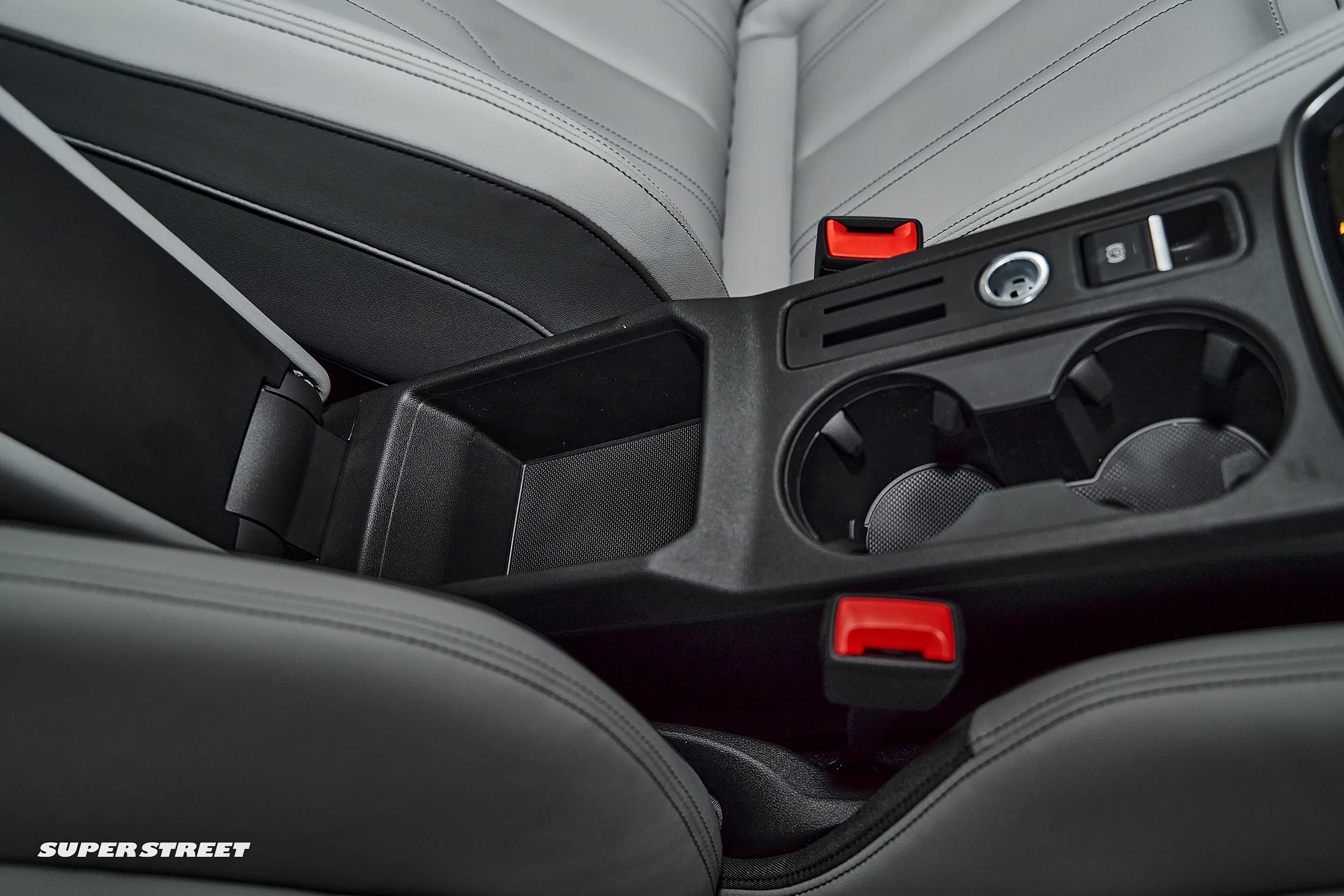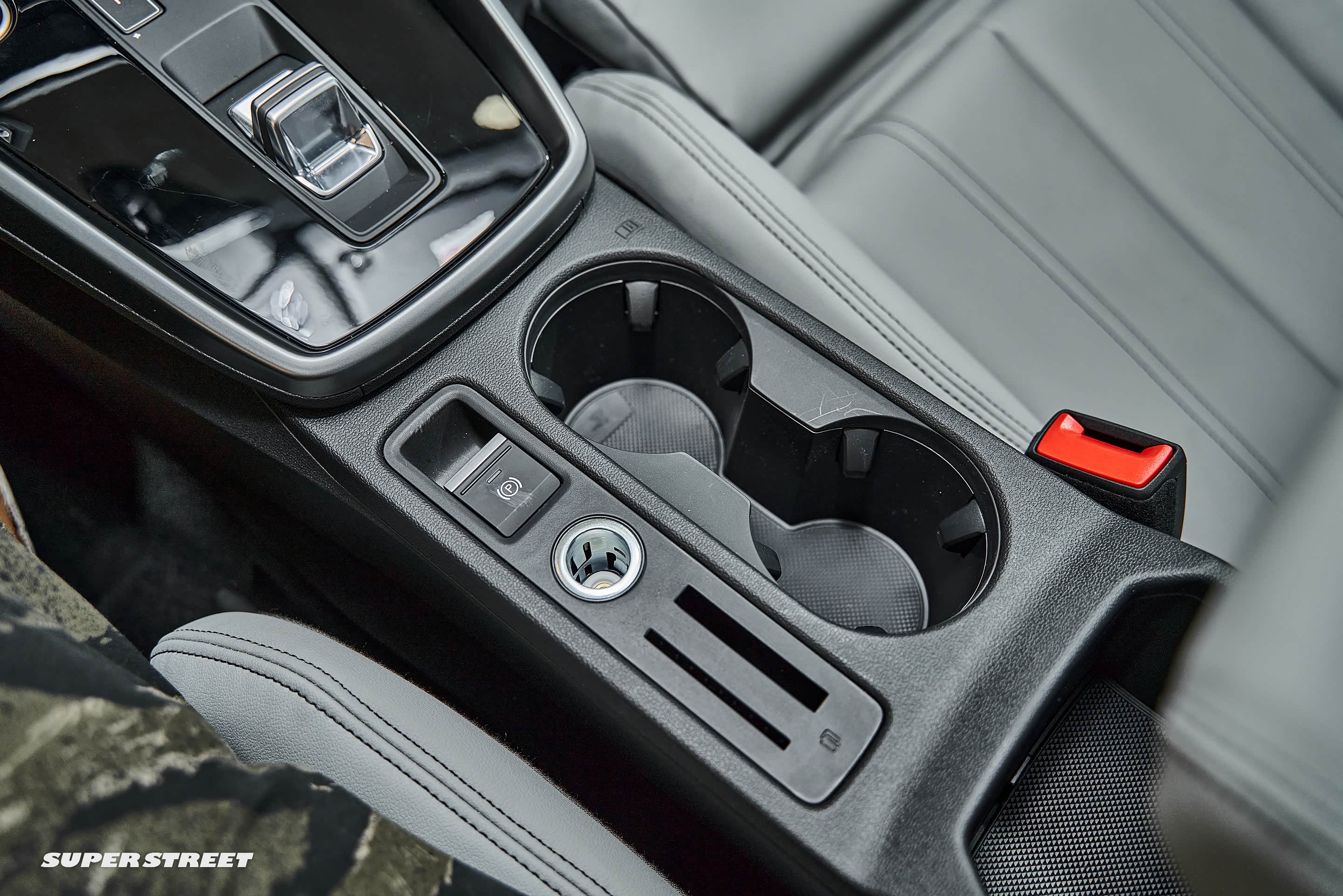 中央区域有两个杯架的位置,还有放置卡片的插槽。带有电子驻车功能。还有一个点烟器插口。