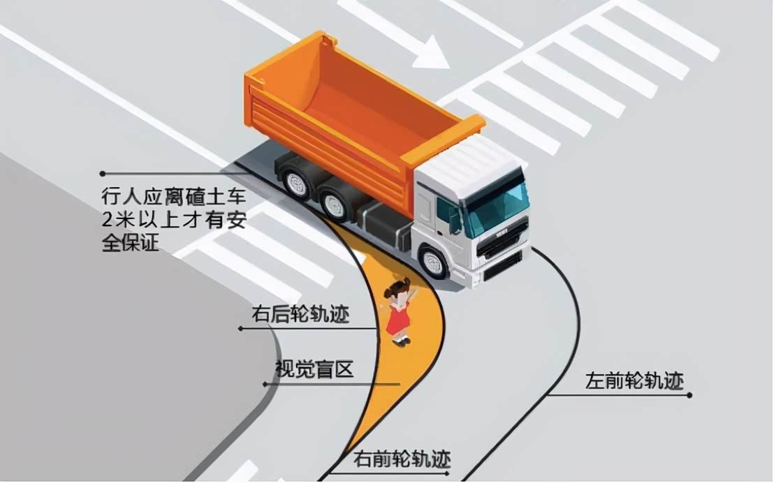 如上图的黄色区域一定要远离,看似那个区域距离车头很远,但内轮差的存在会让车的后轮碾压过这个区域。过马路时要与机动车始终保持距离,记住:1.5米以上!行人和家长也要遵守交通规则,特别是家长要看管好自己的孩子,不要让他们在马路上玩耍。