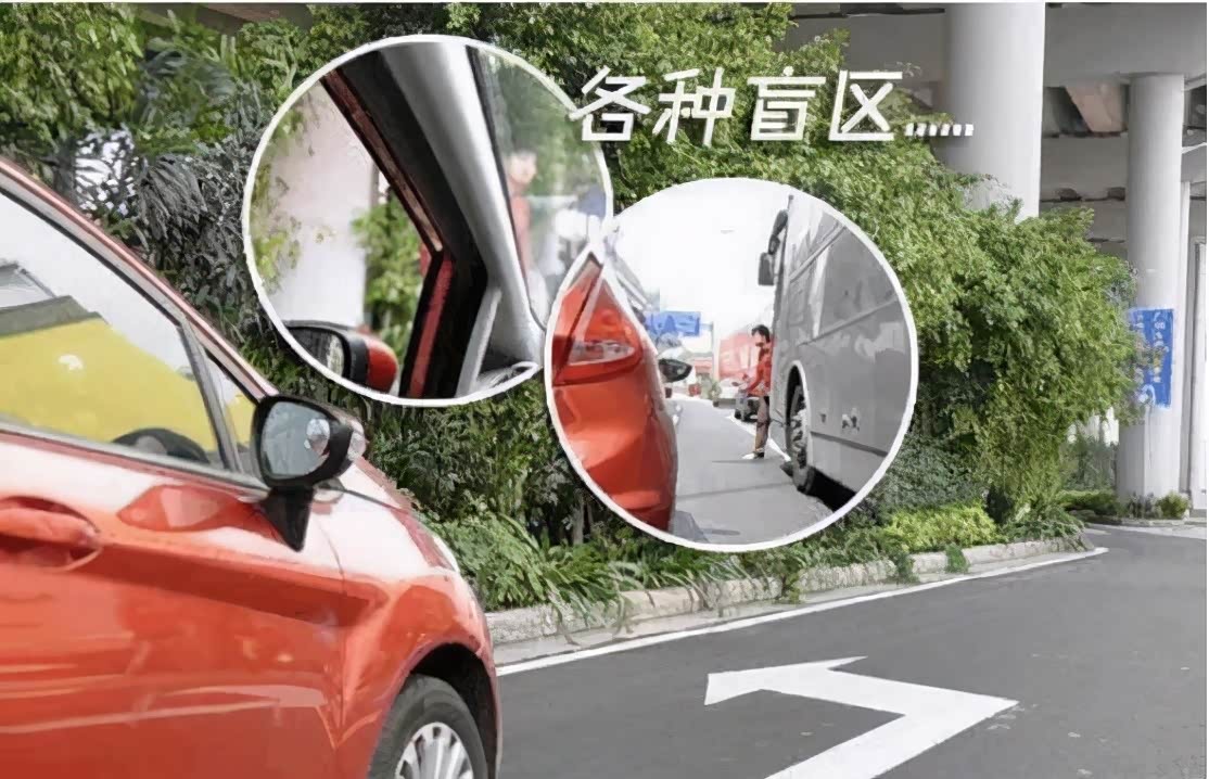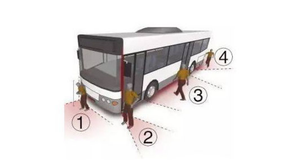 后视镜下方:成人站到后视镜的下方时,公交车司机只能看到一半侧身,大部分身影则被车子梁柱挡住。公交车进站时,前后门都会打开,前后橡胶边会挡住后视镜。