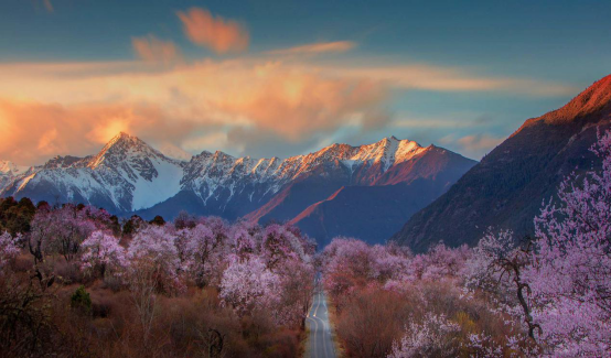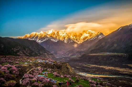 索松村地处雅鲁藏布江大峡谷,以桃花雪山景观而著称。开阔的牧场,千树万树的桃花竞相绽放,花瓣随风轻柔地飘舞,飘到南迦巴瓦的山脚下,待到日落西山,金色的余晖缓缓升起,照耀在南迦巴瓦之上,让人终生难忘。
