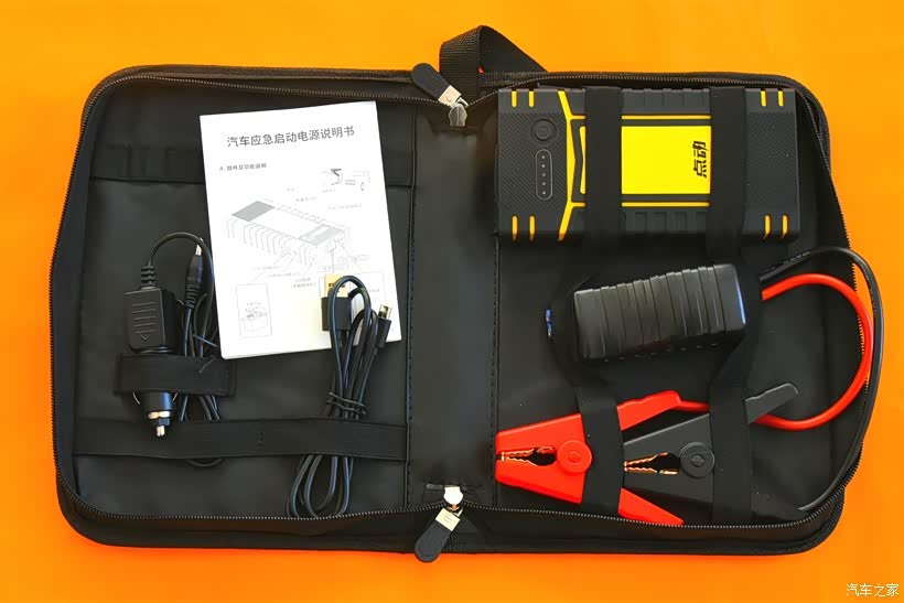 收纳包内的物品有:应急启动电源主机、智能防反接电瓶夹、、车载充电线、U口充电输出两用电源线、还有一个非常详尽的说明书。