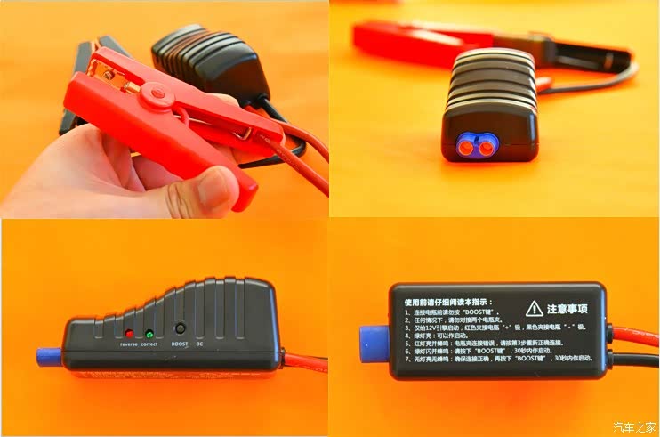 电瓶夹的电源线采用多股铜线,导电性能良好。铜制夹头不易生锈,导电良好。蓝色的与应急电源连接的接头,有防反接设计。反接不能插入。智能线夹盒上设计有红绿指示灯及BOOST增大功率的办隐藏式按键。