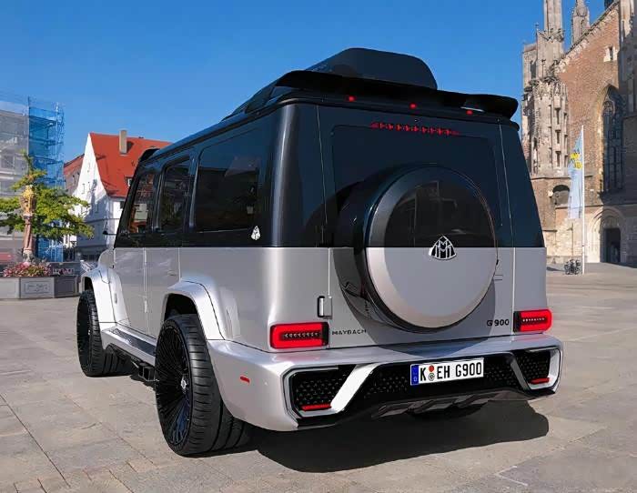 来到尾部方面,尾部的整体设计相信非常的熟悉,顶部突出的扰流板为尾翼的设计,形成了很强的运动感,并且外挂式的备胎悬挂于中央,并且迈巴赫的车标则是明显的镶嵌其中,彰显其尊贵的身份,而尾灯则是设计得非常靠下,辨识度稍微有些弱,而下方的保险杠则是完美的呼应了车头的保险杠,一体感非常的浓厚。