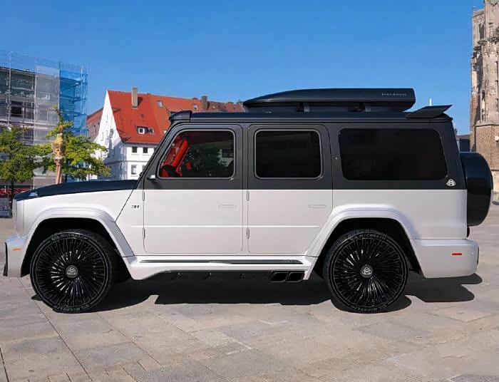 车身侧面部分,新车采用了非常明显的双色车身设计,这样的设计也符合迈巴赫一贯的配色设计,顶部有着行李箱的加入,增加了装载能力,而腰线与外观都是非常的平直,看起来十分硬朗,而轮眉则是采用了外突的梯形设计,并且中央的脚踏板还连接了两侧的轮眉,形成了较强的一体感,而熏黑的多幅式轮毂则是更为的炫酷。