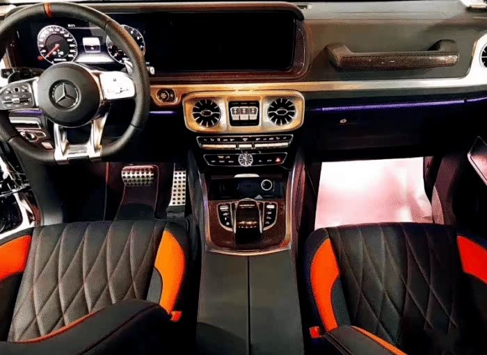 首先来看新车的外观方面,新车的外观依旧有着经典奔驰G级的设计,不过方正的外观确是增加了些许的圆润气息,看起来更加的饱满而敦实,机盖上方的中央处有着隆起的设计,增加了肌肉感,而且两侧标志的转向灯也依旧延续了下来,中央则是多了迈巴赫的立标设计,彰显了新车的档次,大面积的熏黑中网内部为瀑布式的熏黑饰条设计,与两侧未来感十足的墨蓝色圆形大灯相结合,十分的炫酷,下方的保险放则是凹凸有致,在配置熏黑的网状设计装饰,显得运动感十足。