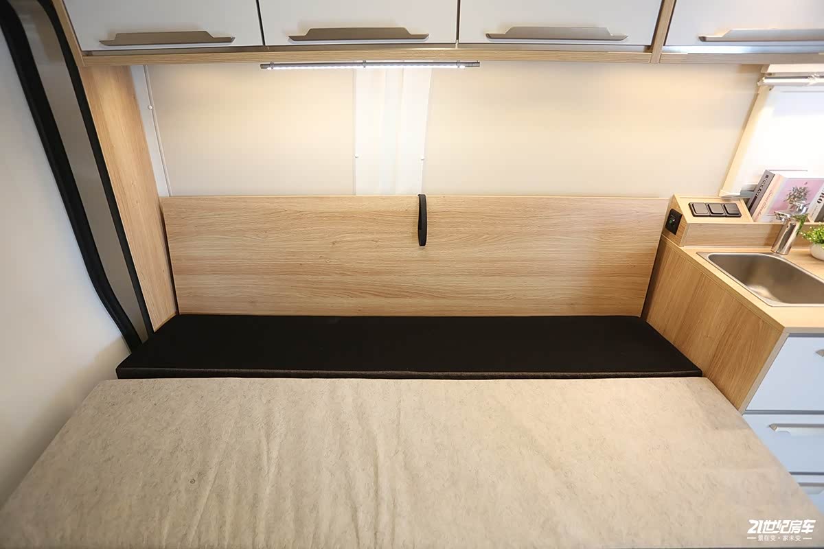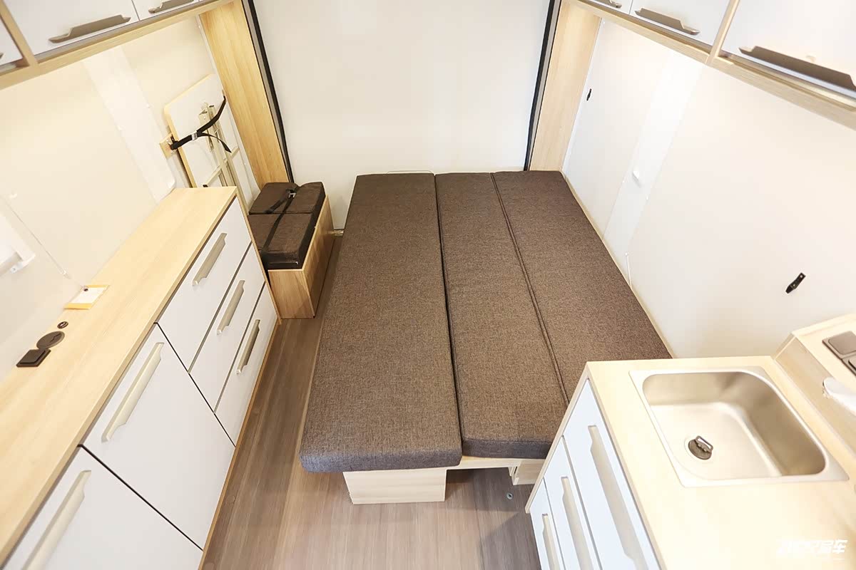 这款车的内部布局单一且固定,无论从车内那个角度看都能一览无余,我们也可以说视线比较通透,也正是因为这一点,它才是真正意义上的搬家工定位,中间过道足够大,才能为“搬家”发挥作用。车内前后没有窗户,只有左右两侧各一扇侧窗,顶部一扇换气天窗,其他地方非常隐蔽。当然室内的家具板材(橡木)都是按照科诺斯旗下其他房车标准配比,轻量化非常好,如果不是因为双轴的设定,它的整备质量还能再降100公斤。
