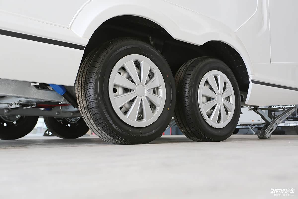 很少有6米左右拖挂采用中置双轴设计,科诺斯Deseo如此设计正是为了满足其“搬家”的载重属性。标配车型搭配14英寸铁轮毂,高配车型才会搭配更大尺寸铝合金轮毂,好在低配有塑料轮毂罩并不觉得单薄。