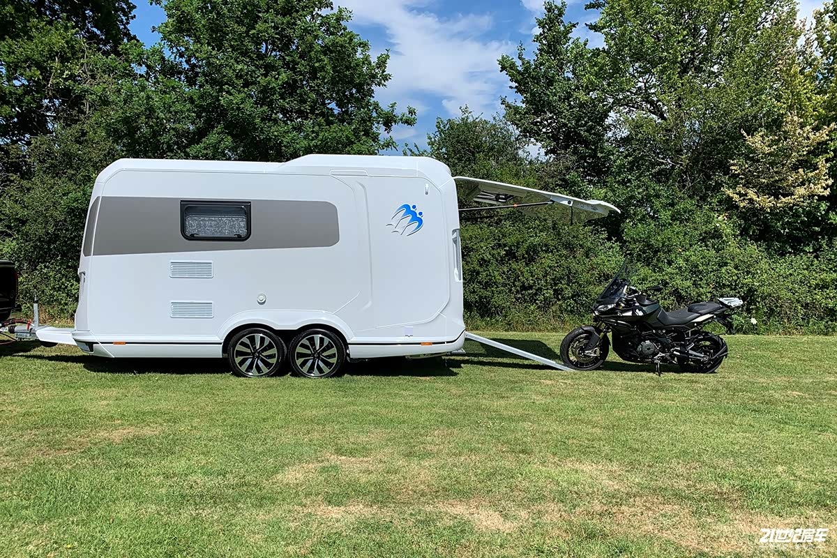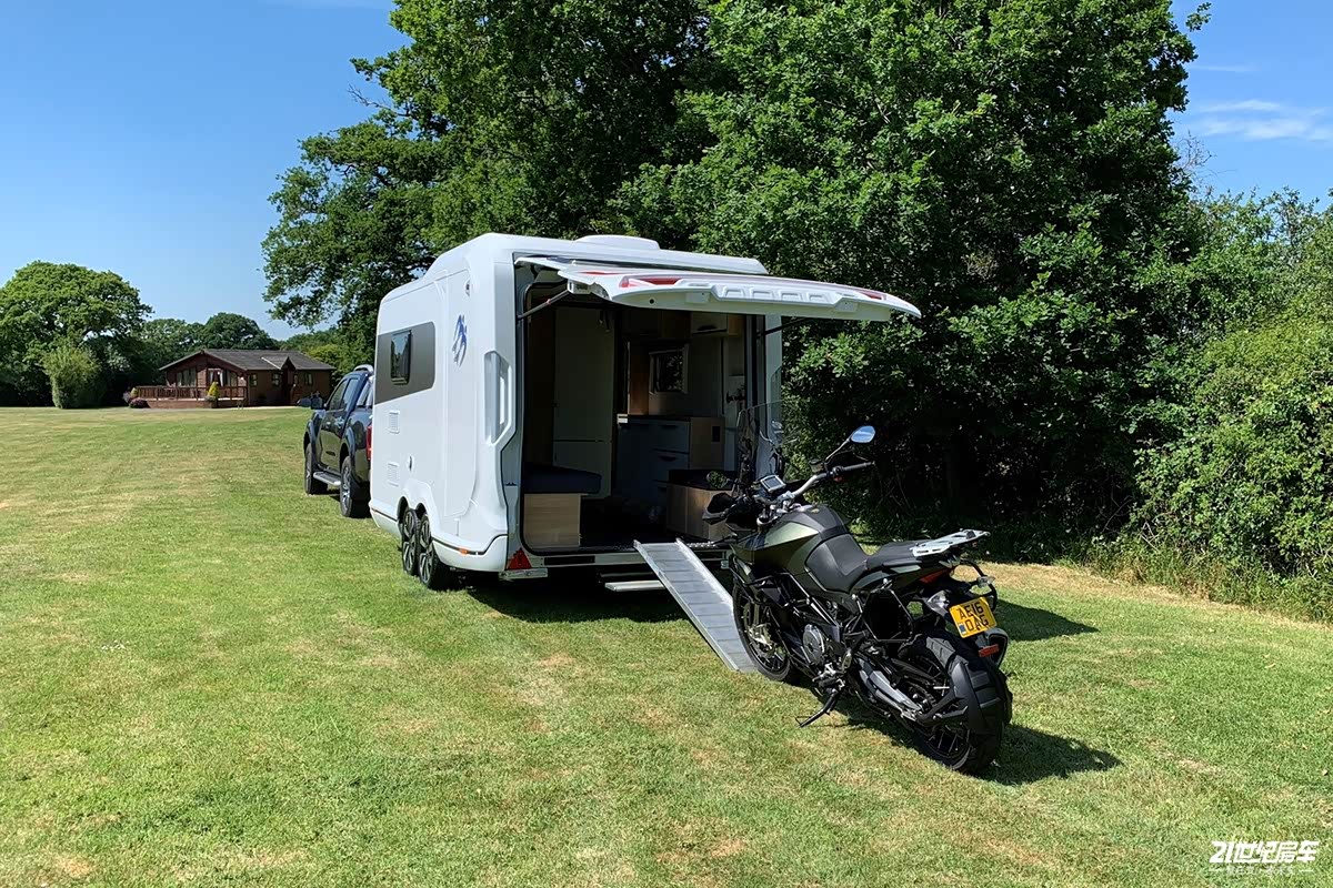 作为一款“载重”大于“居住”功能的拖挂房车,它可以从车尾上掀门处停放两款摩托车或者3台自行车,地板上有锚点以便固定。