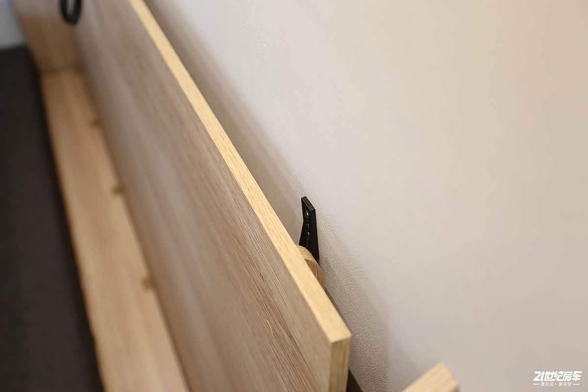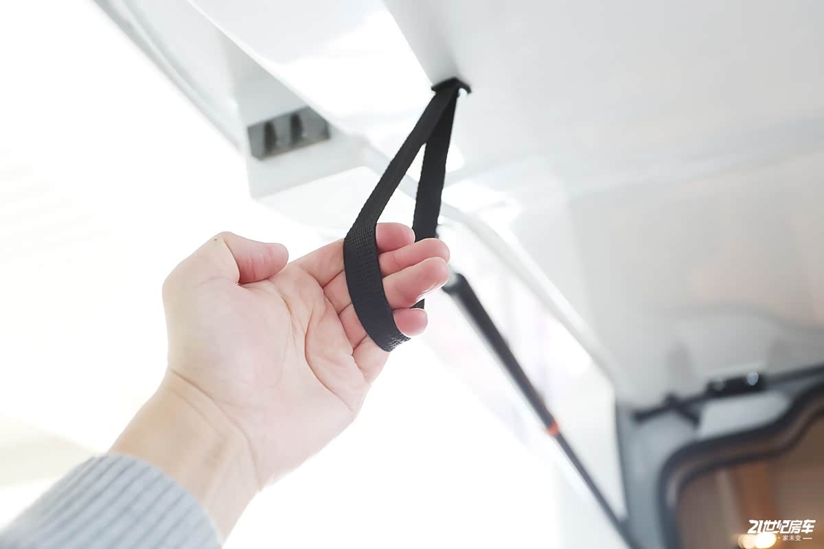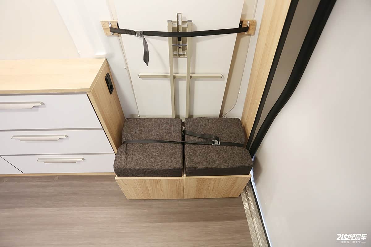 从后上车,右手边第一个看到的就是模块化的家具,两个方形小凳被绑带固定,使用时可以搬动,侧壁固定的餐桌也能取下来,用餐的时候才用得到。