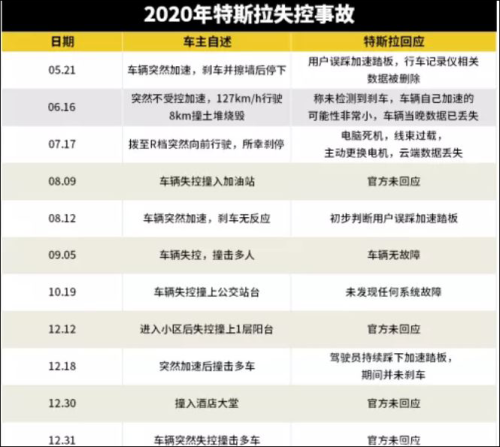 据不完全统计,2020年特斯拉在中国至少发生11起失控事故。
