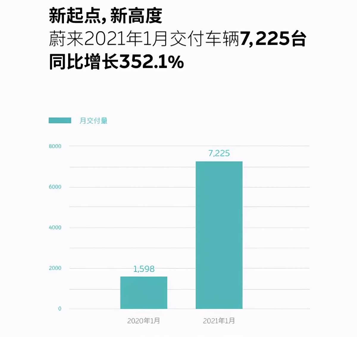 1月份,蔚来共交付新车7225辆,相比上月7007台的交付虽然只是略有上升,但是同比增长却达到了352.1%,连续第六个月创品牌单月交付数新高。