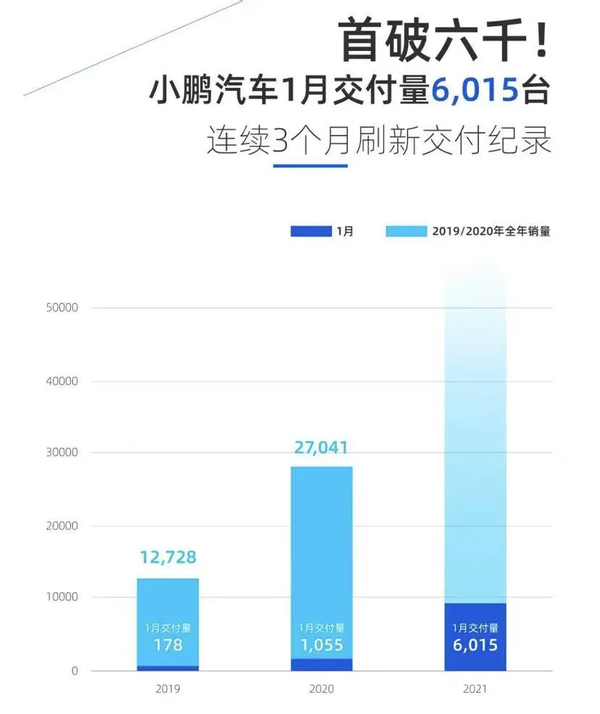 1月份,小鹏汽车的总交付量达到 6,015 台,相比12月5700台的销量增幅为5.5%,同比更是增长470%,连续第三个月创历史最好月交付成绩。