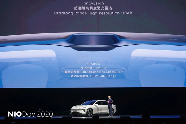 激光雷达开创式的采用暸望塔式的传感器布局,按照蔚来的说法,这是目前全世界看得最远、最清晰的量产激光雷达。