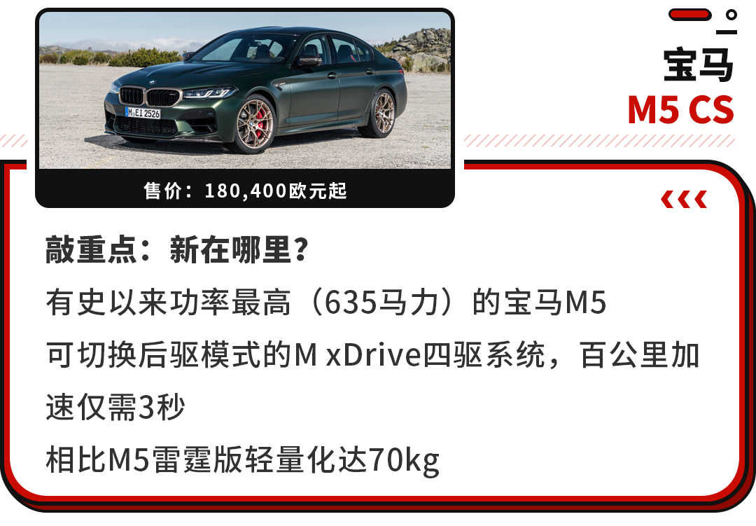 不过相比同级竞品,M5 CS的定价也不算便宜,在德国高达18万欧元起的售价,不仅高于奔驰AMG GT 63 S 4MATIC+,也基本与保时捷Panamera Turbo S相差仅五千欧元不到了。