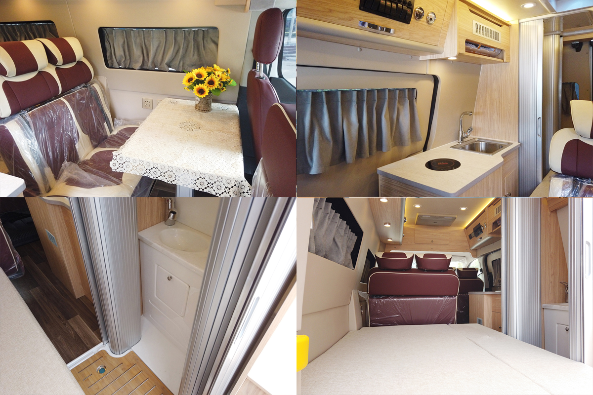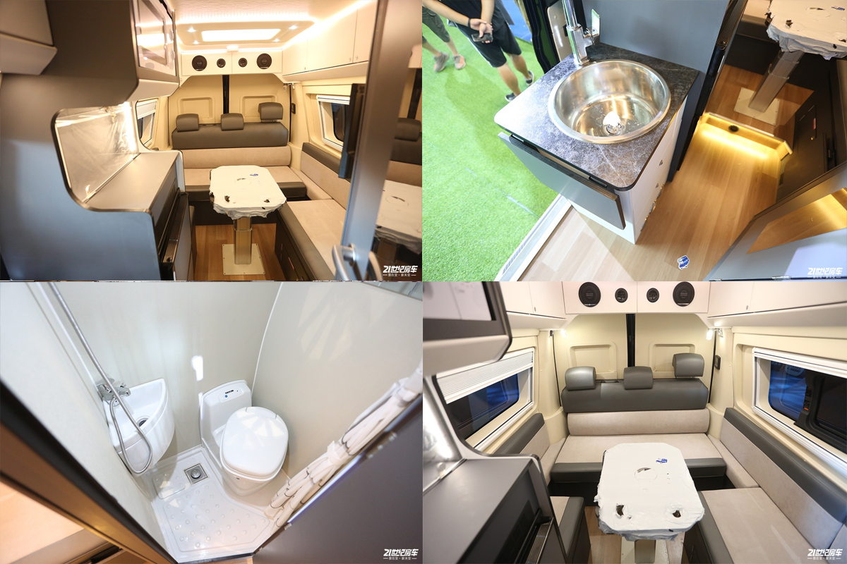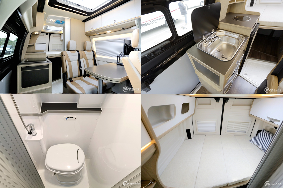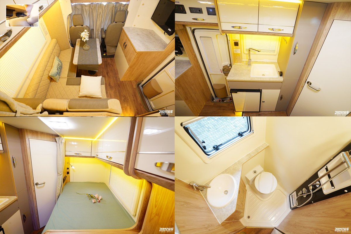 车厢内部采用专业越野房车铝骨蒙皮设计,减轻车身重量同时为车辆带来节能环保的特性。驾驶室上方为车内的固定床位;会客区配备豪华舒适对坐沙发+额头床部分可变为2张豪华大床布局设计,搭配房车专用舒适床垫,满足5名乘员睡眠也不成问题。此外游艇柚木面板的顶部双置物吊柜对应折叠餐桌与房车专用门窗,体现了轻奢感与舒适感完美结合。厨房设置在乘客门右侧,配备德国进口电陶炉、微波炉及50L进口冰箱等。车内的卫生间由于升降顶结构的特点而采用了半开放式结构,带有独立的卫生间推拉门,卫生间内部空间较为紧凑,配备了多美达可旋转式座便器,旋转式洗手池及淋浴花洒;卫生间内采用了防水及防滑地板设计以满足乘客淋浴需求,卫生间内设有一扇外推窗以加强通风换气效果。水路系统方面,该车配备100升冷水箱、40升灰水箱及20升黑水箱。