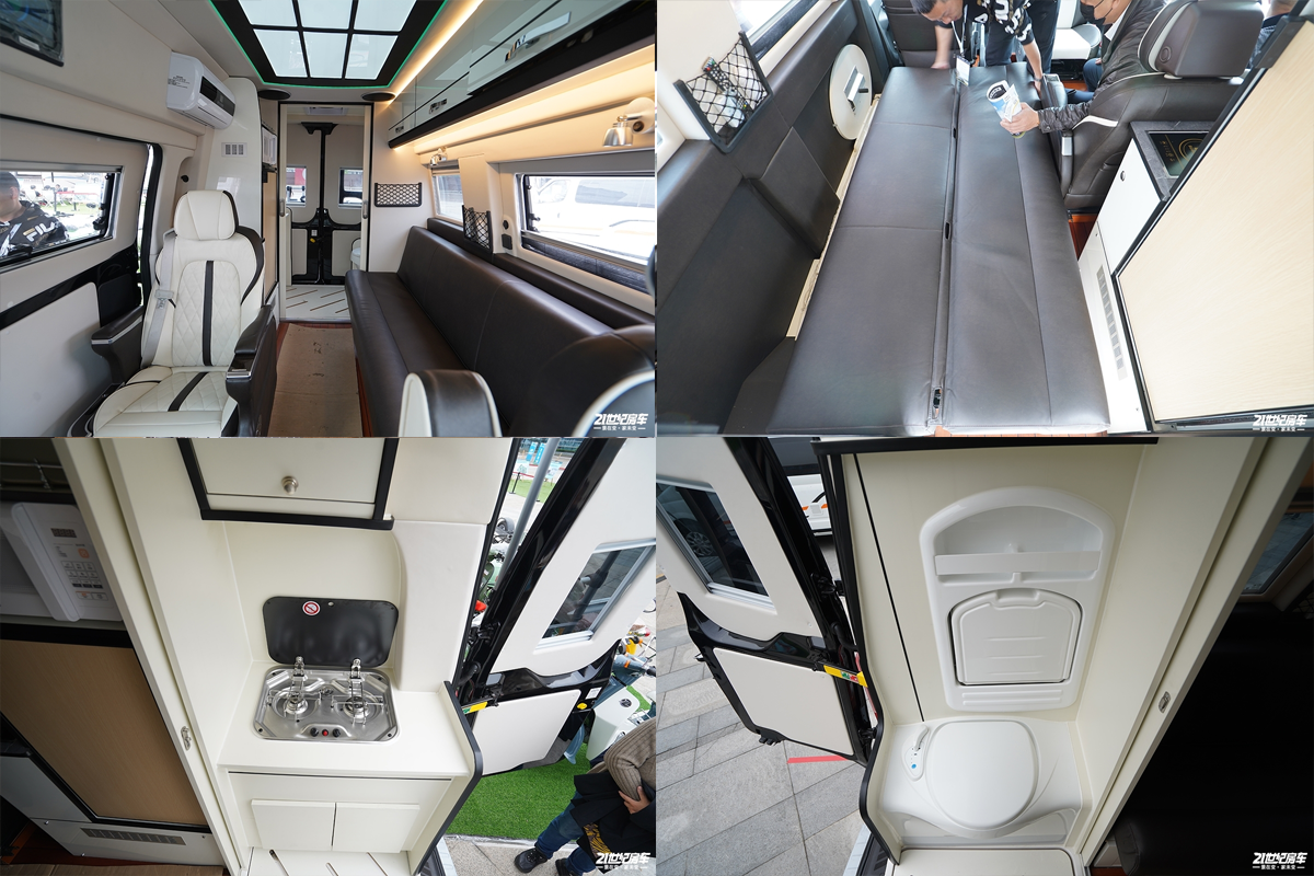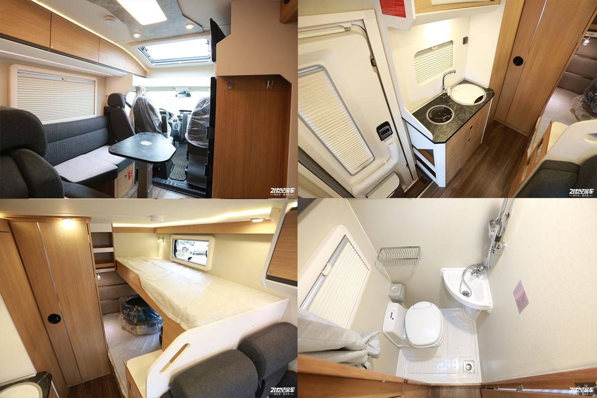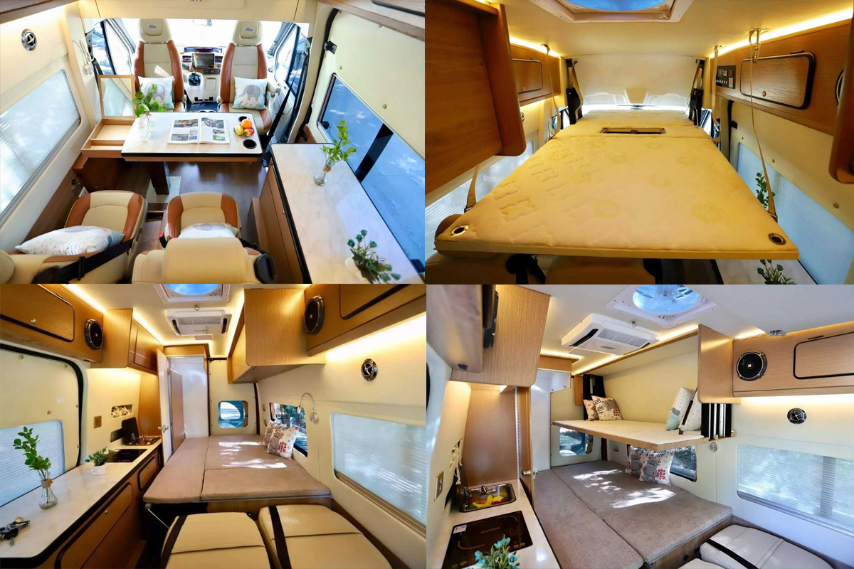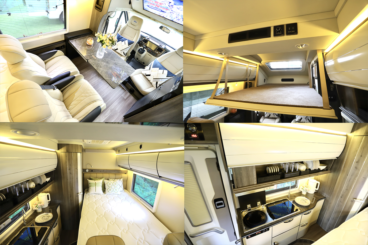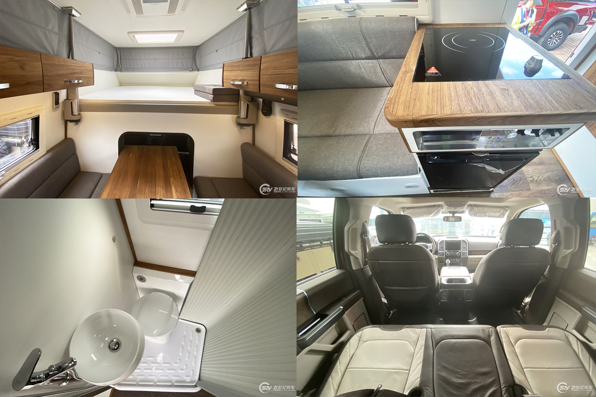 车厢内部采用专业越野房车铝骨蒙皮设计,减轻车身重量同时为车辆带来节能环保的特性。驾驶室上方为车内的固定床位;会客区配备豪华舒适对坐沙发+额头床部分可变为2张豪华大床布局设计,搭配房车专用舒适床垫,满足5名乘员睡眠也不成问题。此外游艇柚木面板的顶部双置物吊柜对应折叠餐桌与房车专用门窗,体现了轻奢感与舒适感完美结合。厨房设置在乘客门右侧,配备德国进口电陶炉、微波炉及50L进口冰箱等。车内的卫生间由于升降顶结构的特点而采用了半开放式结构,带有独立的卫生间推拉门,卫生间内部空间较为紧凑,配备了多美达可旋转式座便器,旋转式洗手池及淋浴花洒;卫生间内采用了防水及防滑地板设计以满足乘客淋浴需求,卫生间内设有一扇外推窗以加强通风换气效果。水路系统方面,该车配备100升冷水箱、40升灰水箱及20升黑水箱。