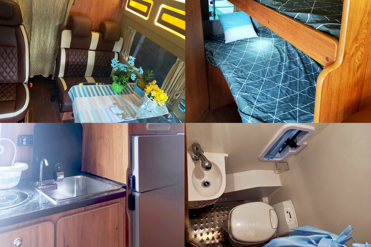 商旅版是由可拼床沙发会客区+厨房区+卫生间+横置床组成,内部配备了220V插座、房车冰箱、洗菜池、马桶、水龙头等生活配置。