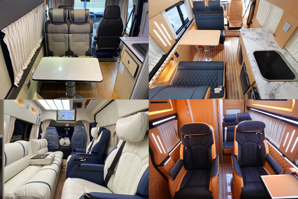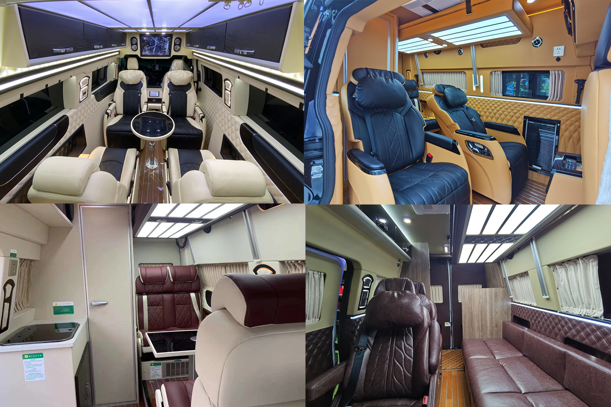 至尊沙发床版车内布局为由前向后分别为会客区、车尾半开放式的厨房+卫生间。会客区采用长条沙发+两个六项可调节航空旋转座椅设计,长条沙发可以和航空座椅可以拼接成一张临时床,满足两至三人睡眠需求。沙发床的顶部还设有一张电动吊床,吊床底部是超大的造型灯,照亮整个会客区域。尾部厨房及卫生间区域可通过滑动门与前部会客区分离,厨房配有带盖洗菜池,车载冰箱及微波炉等设施;卫生间配有叠式洗手池、进口抽拉式座便器及抽拉淋浴器等,可满足日常出行的基本需求。