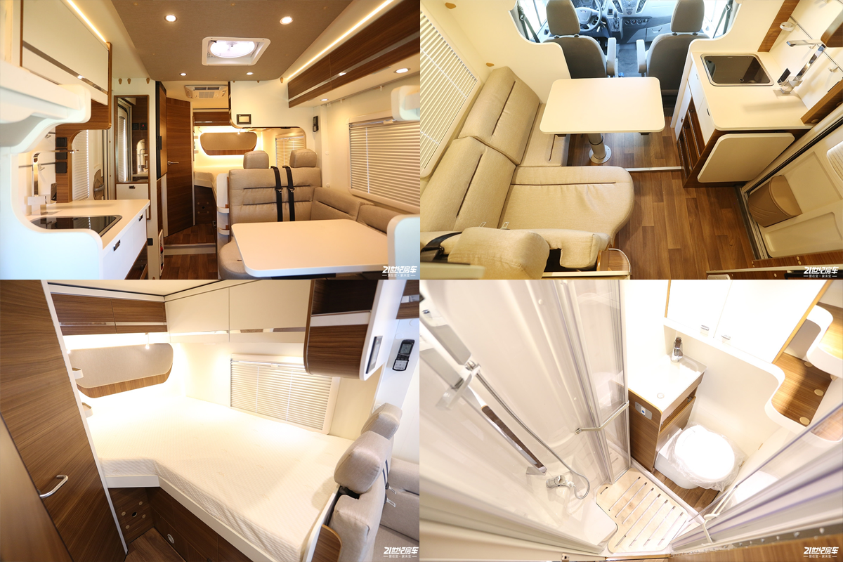 车内会客区L型卡座沙发为布艺包覆,搭配升降式餐桌临时可拼成一张沙发床,会客区后是一张异形的双人床;对面分别为厨房区及卫生间;配置方面:标配迈克斯10速防雨换气扇、多美达房车门、多美达CE99水槽、多美达冷暖空调、2.4米电动风感遮阳棚、富声功放系统、车载无音箱音响系统、NCE微波炉、LILIE水路管理系统、Riech灰水管理系统、Reich混水系统、Truma电/气极速热水系统、Truma防撞减压阀、Truma燃气过滤系统、埃贝赫汽油风暖系统、Lise四方位平移升降桌、300W如果轻质太阳能充电系统、200Ah锂电池、拓宝3000W充逆变一体机。