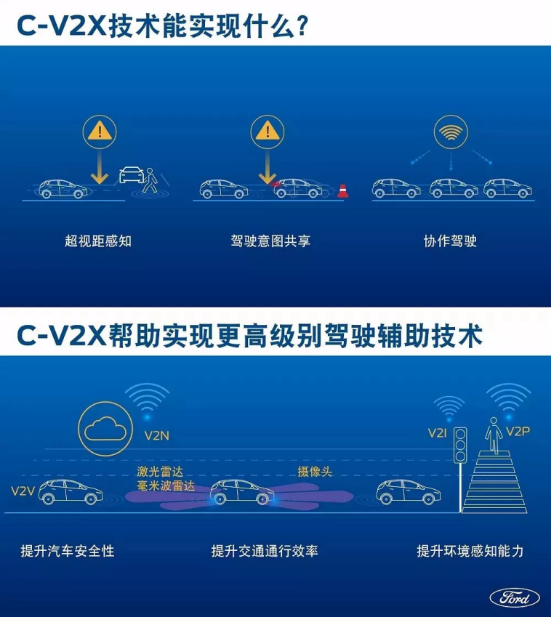 简单来说,C-V2X技术让汽车更好地与城市交通系统融合。 福特基于C-V2X技术研发的车路协同系统目前属于V2I范畴,可以让车可以接收前方道路交通变化信息,按官方说法,它可以“看得更广”、“听到更多”、甚至“预测未来”,听起来有点玄乎,有用吗?怎么用?