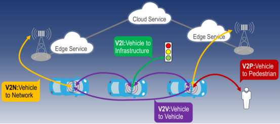 C-V2X主要包括车辆与道路基础设施互联(V2I:Vehicle-to-Infrastructure)、车辆与车辆互联(V2V:Vehicle-to-Vehicle)、车辆与云端应用(V2C:Vehicle-to-Cloud),以及车辆与行人互联(V2P:Vehicle-to-Pedestrian)等多个应用场景。