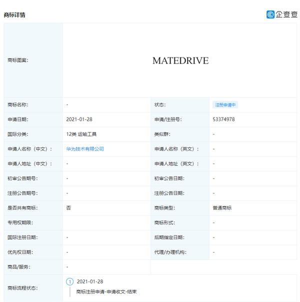根据企查查数据显示,华为在今年1月28日正式提交了“ MATEDRIVE”商标的注册申请,其中文翻译为驾驶、传动 (或驱动)装置等含义,申请号为 53374978,目前商标状态为注册申请中。