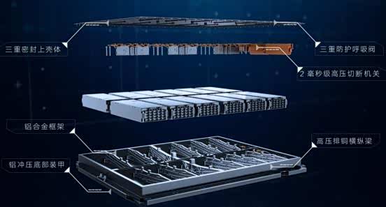 机械测试:以60g的加速度弹射搭载电池包的冲击平台,电池包承受自身重量60倍的冲击力,相比国标25g具有更严苛的碰撞要求和通过标准;模拟车辆底部球击,电池包仍可安全使用;通过车身和电池壳的优化设计,全方位碰撞确保电池模组安全无恙。正面柱碰填补国内碰撞要求空白,碰撞能量高达37.6万焦耳;侧面柱碰覆盖整个电池包范围,碰撞能量是推荐国标和C-NCAP的1.98倍;追尾碰撞左右兼顾,碰撞能量为国标要求的2.82倍。