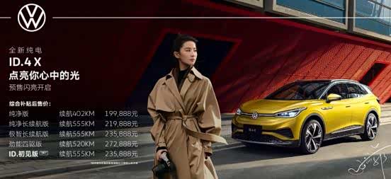 自从上汽大众首款MEB中型纯电SUV ID.4 X公布综合补贴后售价199,888元-272,888元后,关注度就很高。根据续航里程和配置的不同,ID.4 X提供5个车型版本,即纯净版、纯净长续航版、极智长续航版、ID.初见版和劲能四驱版。NEDC工况续航在402km-555km之间。其中,ID.初见版基于极智长续航版而来,带有首批客户专属身份标识。