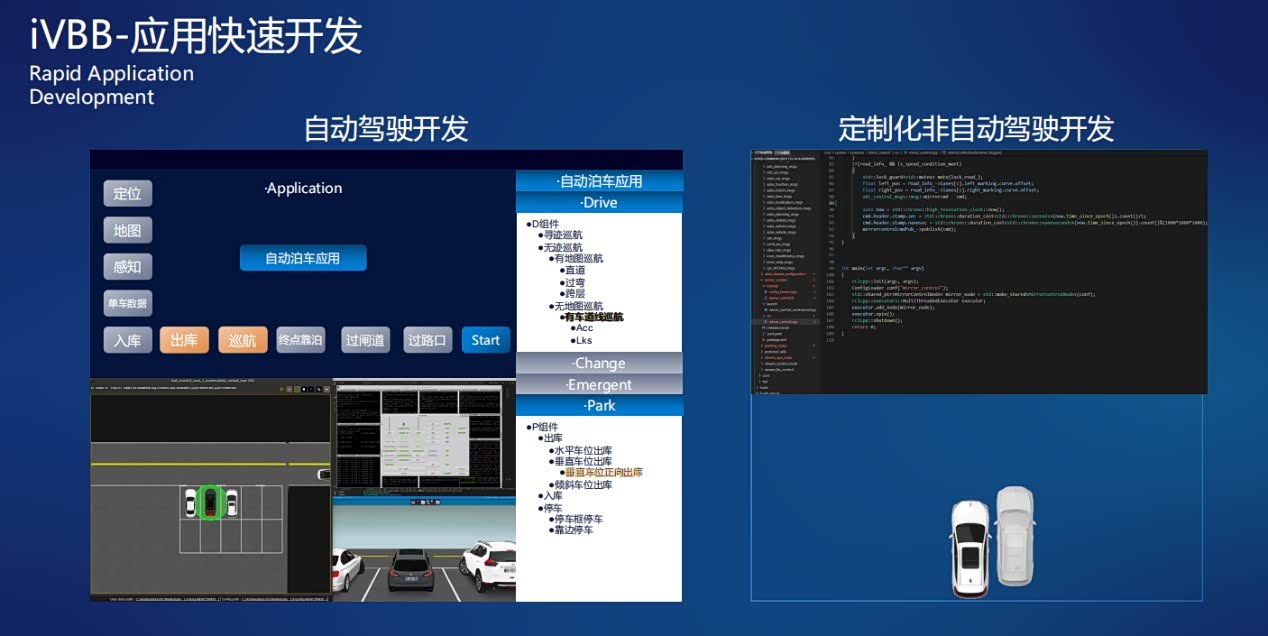 应用快速开发层面,支持自动驾驶和定制化非自动驾驶开发,发布会上,尚进介绍了该平台在自动泊车应用的能力,可以实现无地图巡航、跨层等复杂泊车功能。而和定制化非自动驾驶开发主要面对的是整车的开发,比如,节油方案等。
