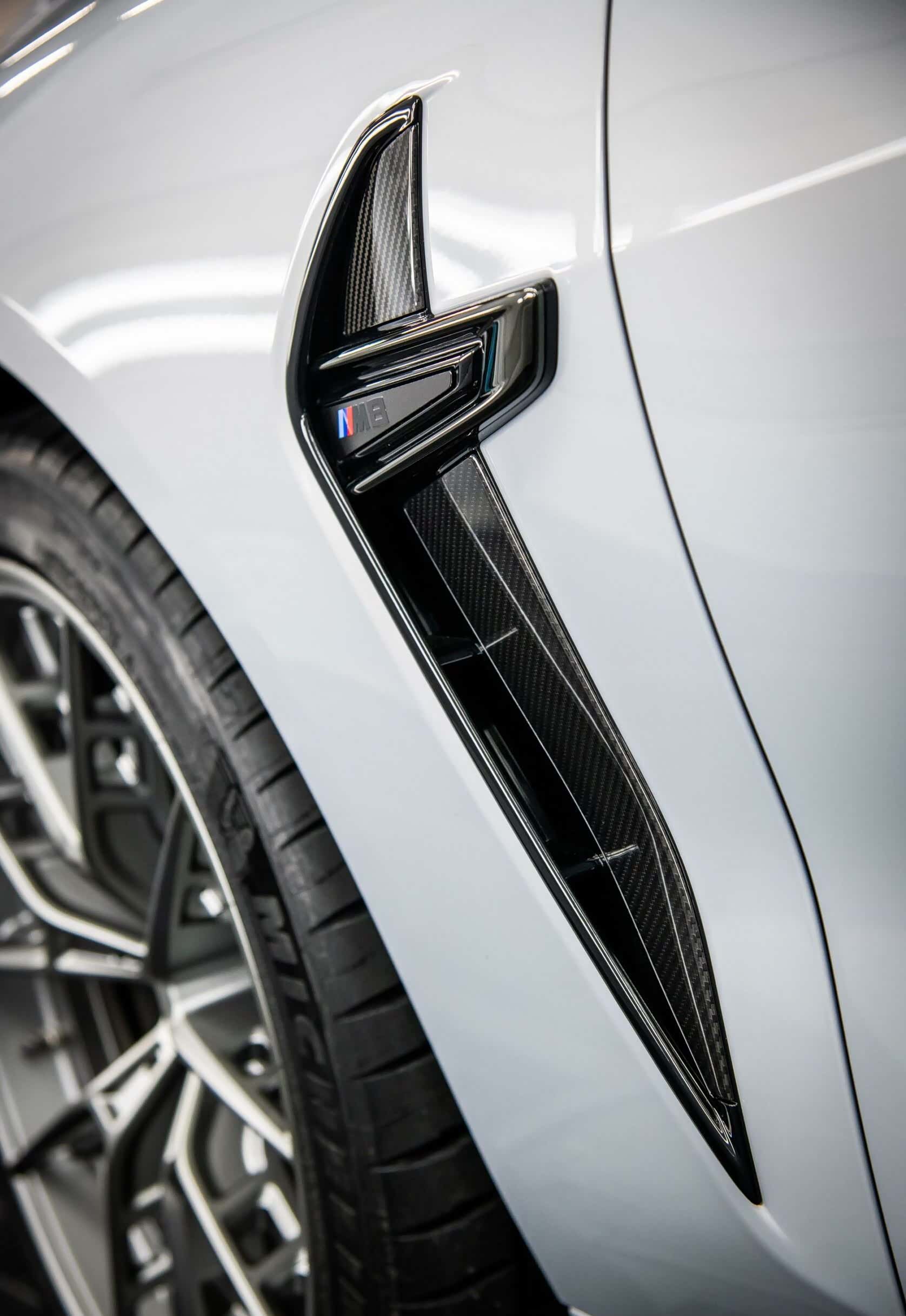 车漆“霍根海姆银”(Hockenheim Silver),20英寸锻造铝合金轮毂,暗灰色的“ Y”轮辐。碳纤维的的前唇,行李箱盖上沿、后扩散器的扰流板、后视镜壳体等,甚至排气端都是轻质材料。