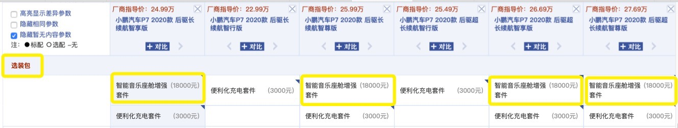 小鹏也有套路,但比较隐晦一点。就说那个丹拿音响,它对外宣传的时候,说音响是丹拿的。但是细细看它的配置表,只要稍微细一点,你就能看到丹拿音响是加装的,需要18000块。