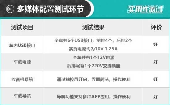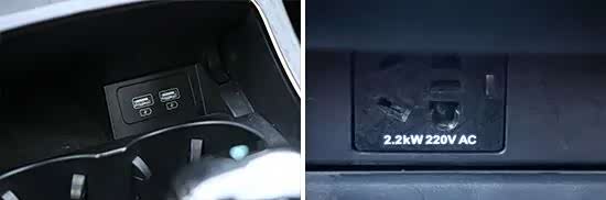 比亚迪汉EV车内共配备了6个USB接口,前排4个;后排2个。同时,我们还对每个USB接口的电压与电流进行了测试,接口电压电流均为10V 1.25A。此外,车内前排还提供了1个12V电源接口,后排空调出风口下方则配有一个220V交流插座。