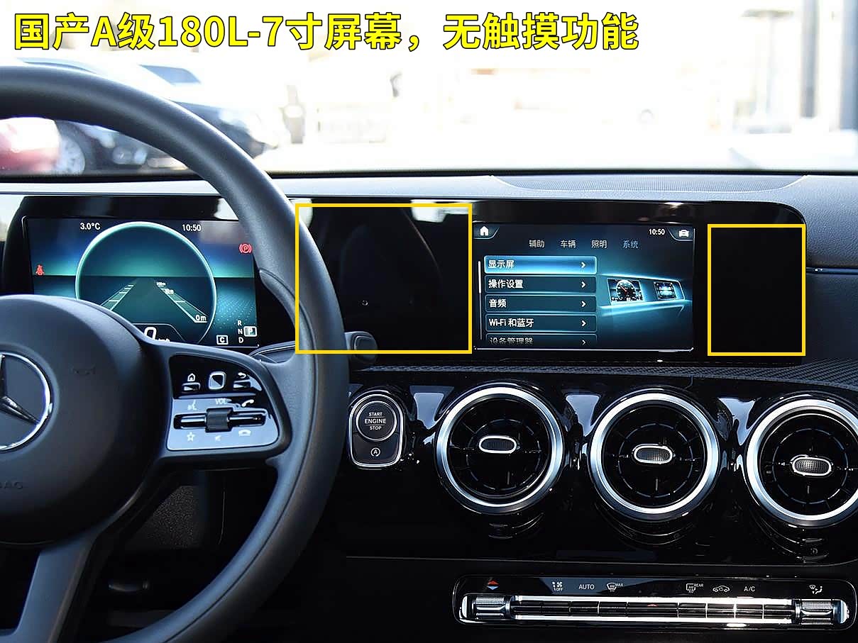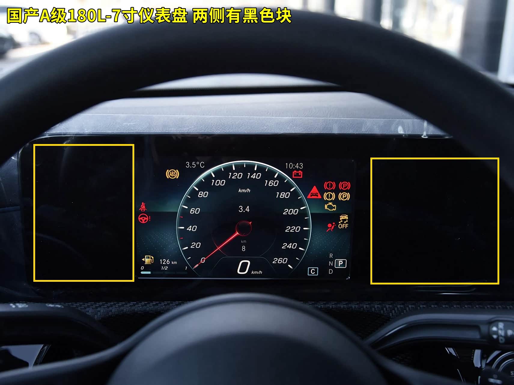 不过需要特别注意的是,并非所有的奔驰A级都是两块10.25英寸高清显示屏,国产的奔驰最低配A180只有2块7寸屏幕,左侧仪表盘是固定显示内容,并且中控屏是不能触摸控制的。这个在体验性方面就要差很多了。而进口的奔驰A级则是标配两块10.25英寸高清显示屏,所以强烈建议不要买最低配的国产A级。