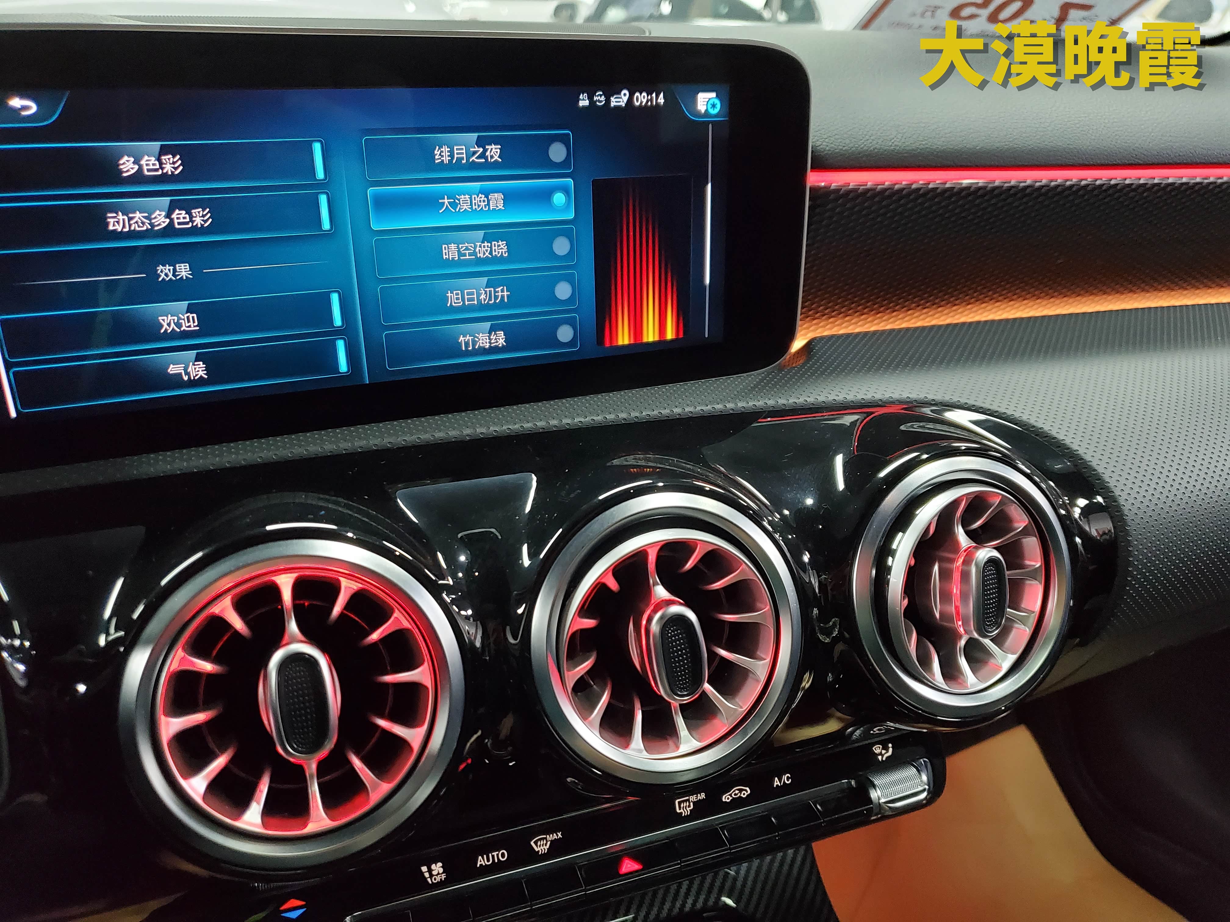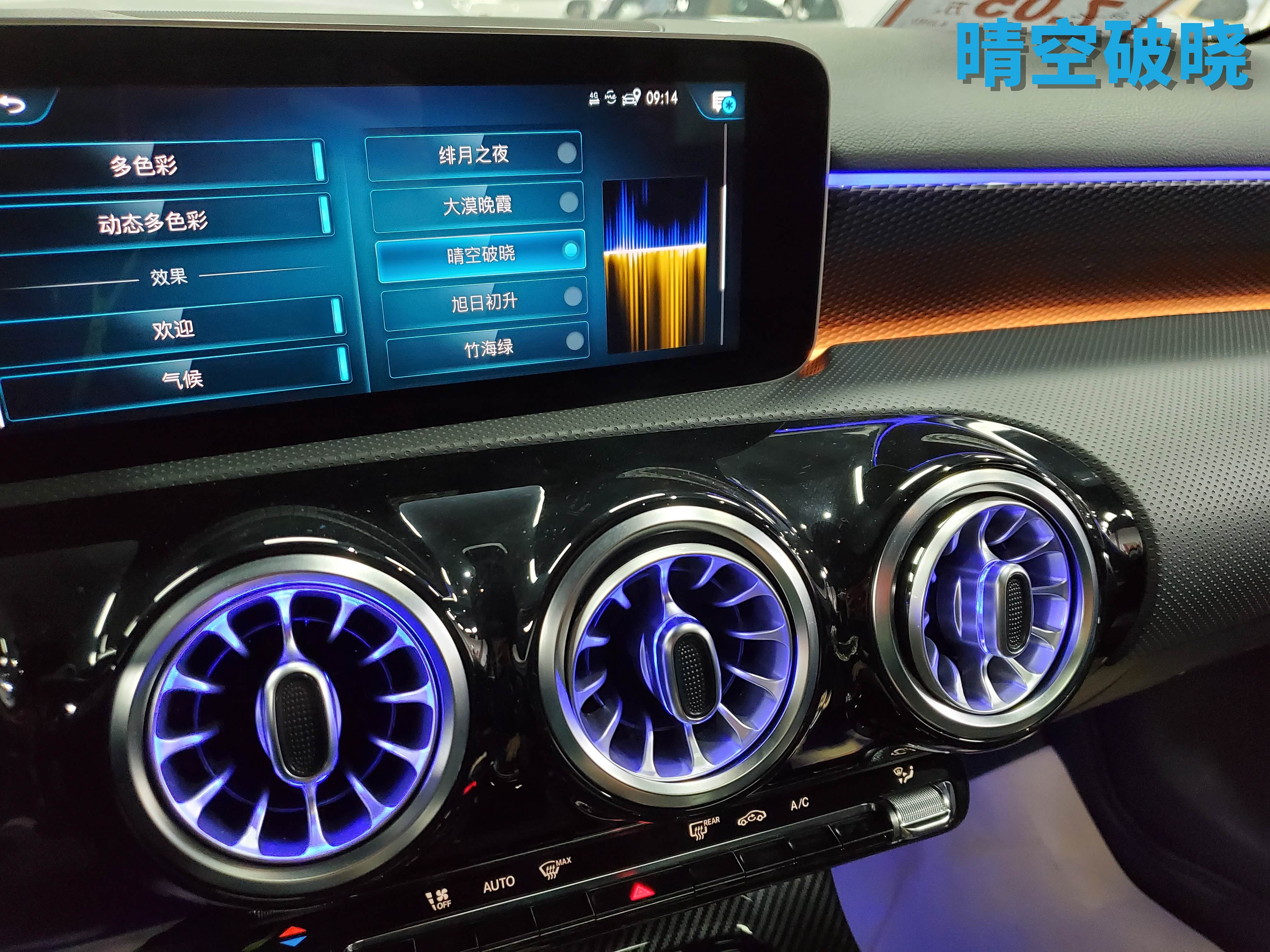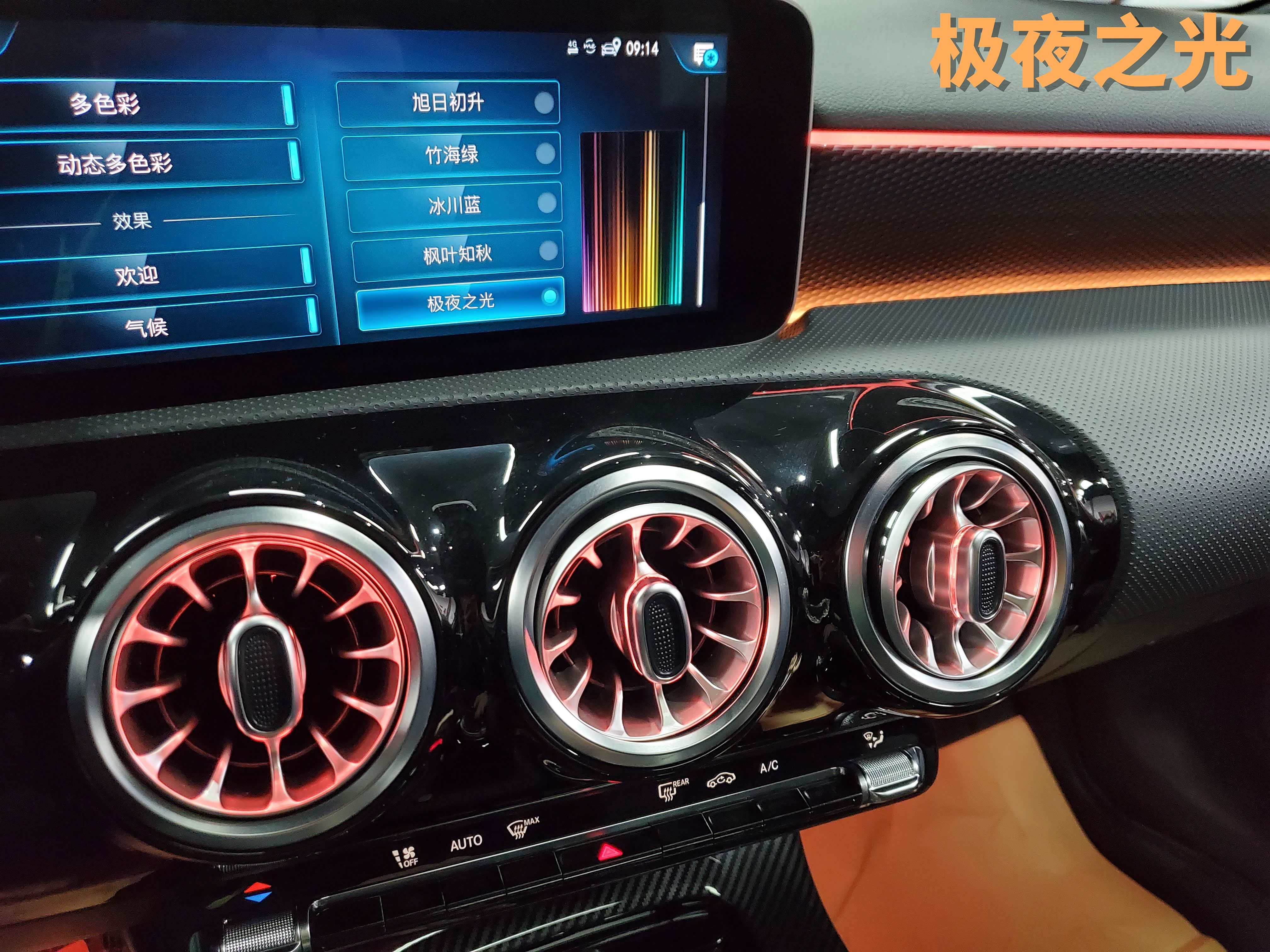 奔驰A级虽然LED灯源数量不如S级那么多,但是在氛围灯的颜色种类、色彩显示方面也算是同价位车型里最漂亮的了。和S级一样,不光有普通的单色,还有多彩色。每种多彩色还有一个特别文艺的名字,例如旭日初升、竹海绿、冰川蓝、枫叶知秋、极夜之光、大漠晚霞、晴空破晓等等,并且空调出风口也会随之而变换不同的颜色。下面的图片都是白天拍的,如果是夜晚状态会更漂亮。
