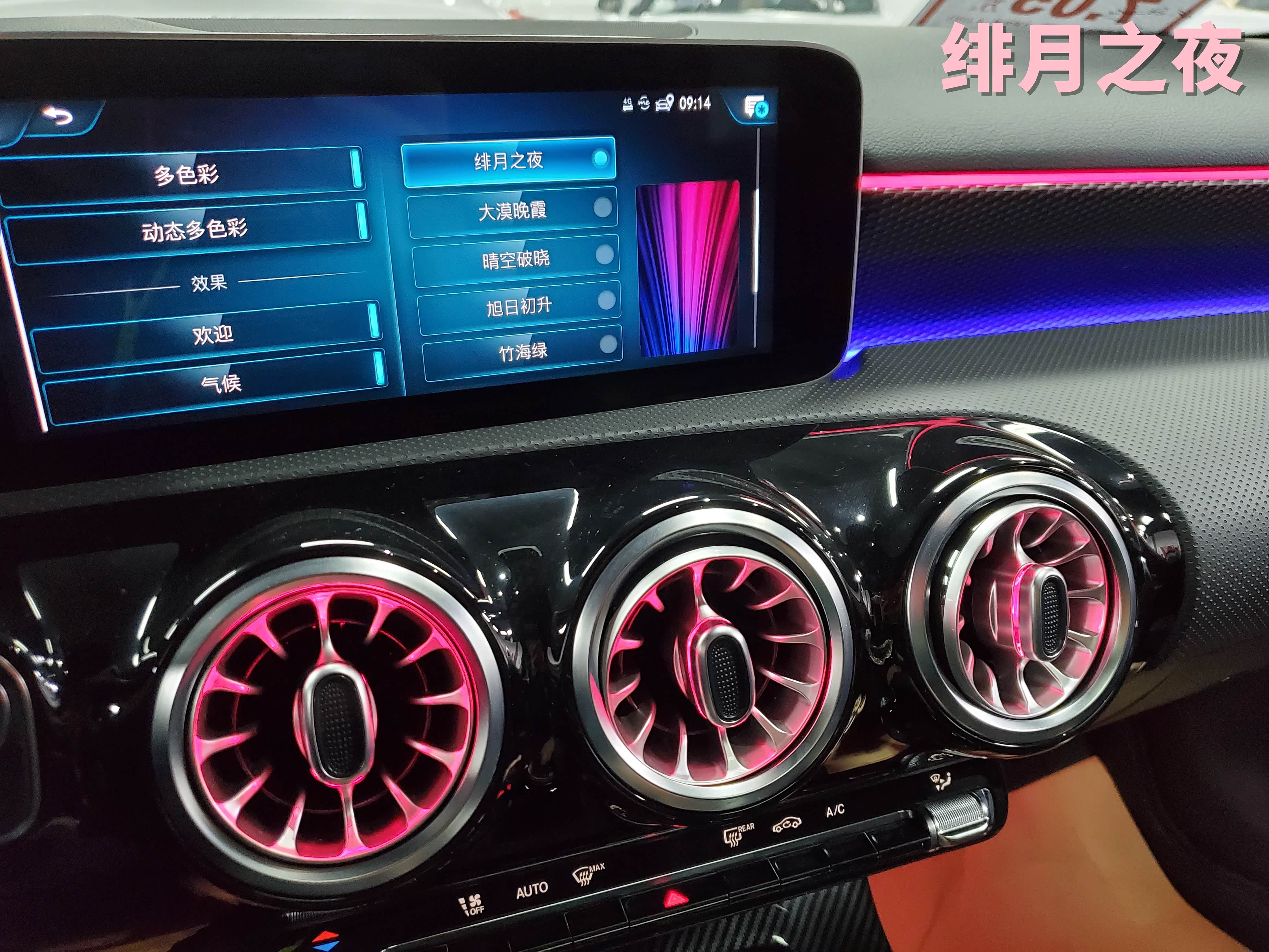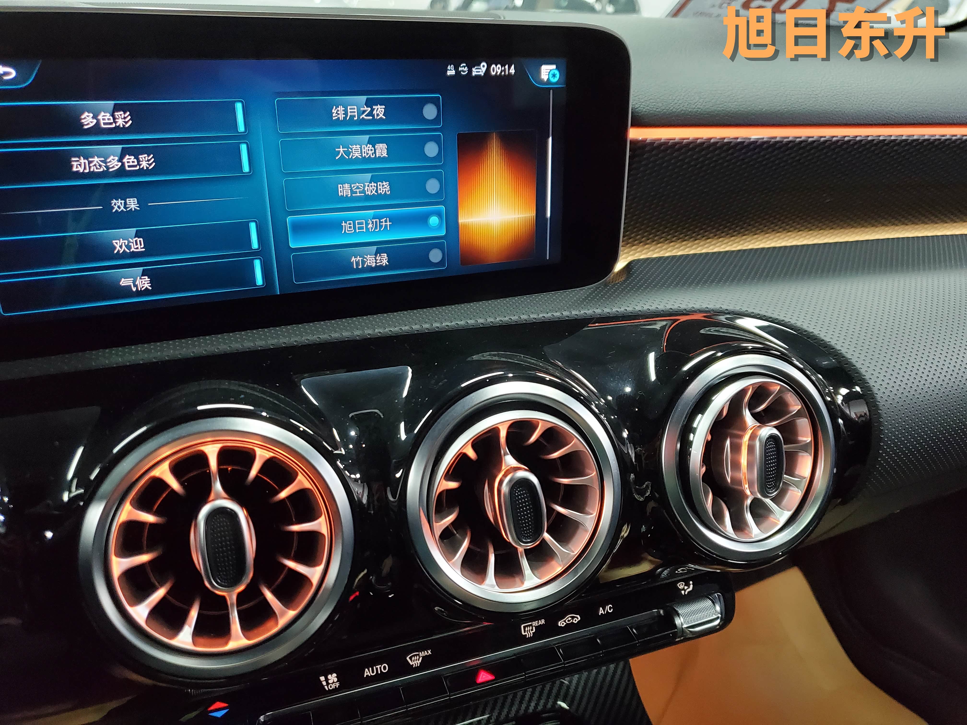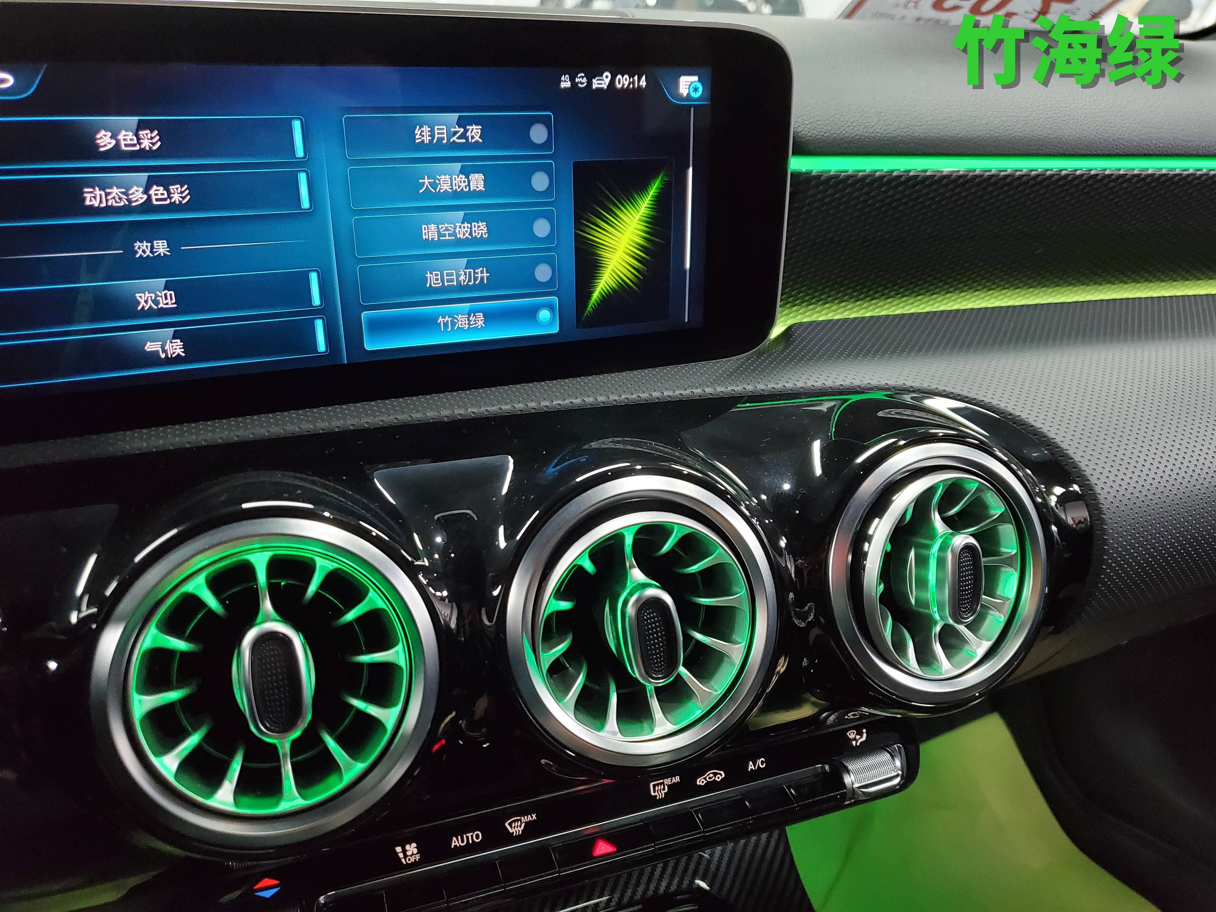 奔驰A级虽然LED灯源数量不如S级那么多,但是在氛围灯的颜色种类、色彩显示方面也算是同价位车型里最漂亮的了。和S级一样,不光有普通的单色,还有多彩色。每种多彩色还有一个特别文艺的名字,例如旭日初升、竹海绿、冰川蓝、枫叶知秋、极夜之光、大漠晚霞、晴空破晓等等,并且空调出风口也会随之而变换不同的颜色。下面的图片都是白天拍的,如果是夜晚状态会更漂亮。
